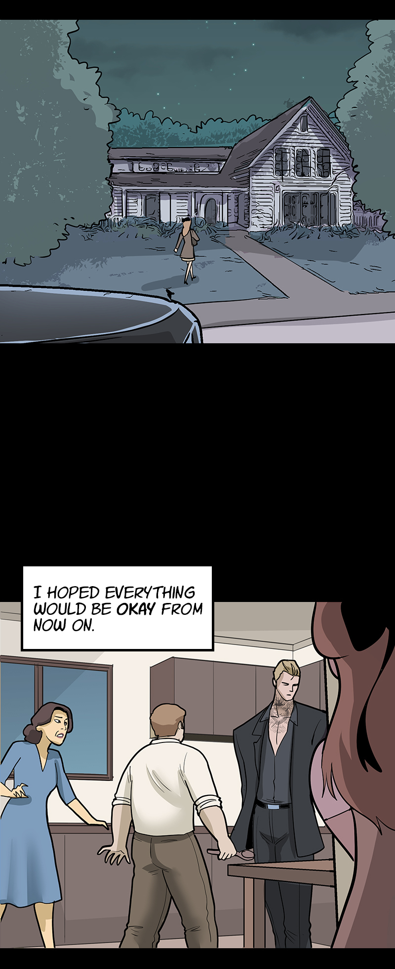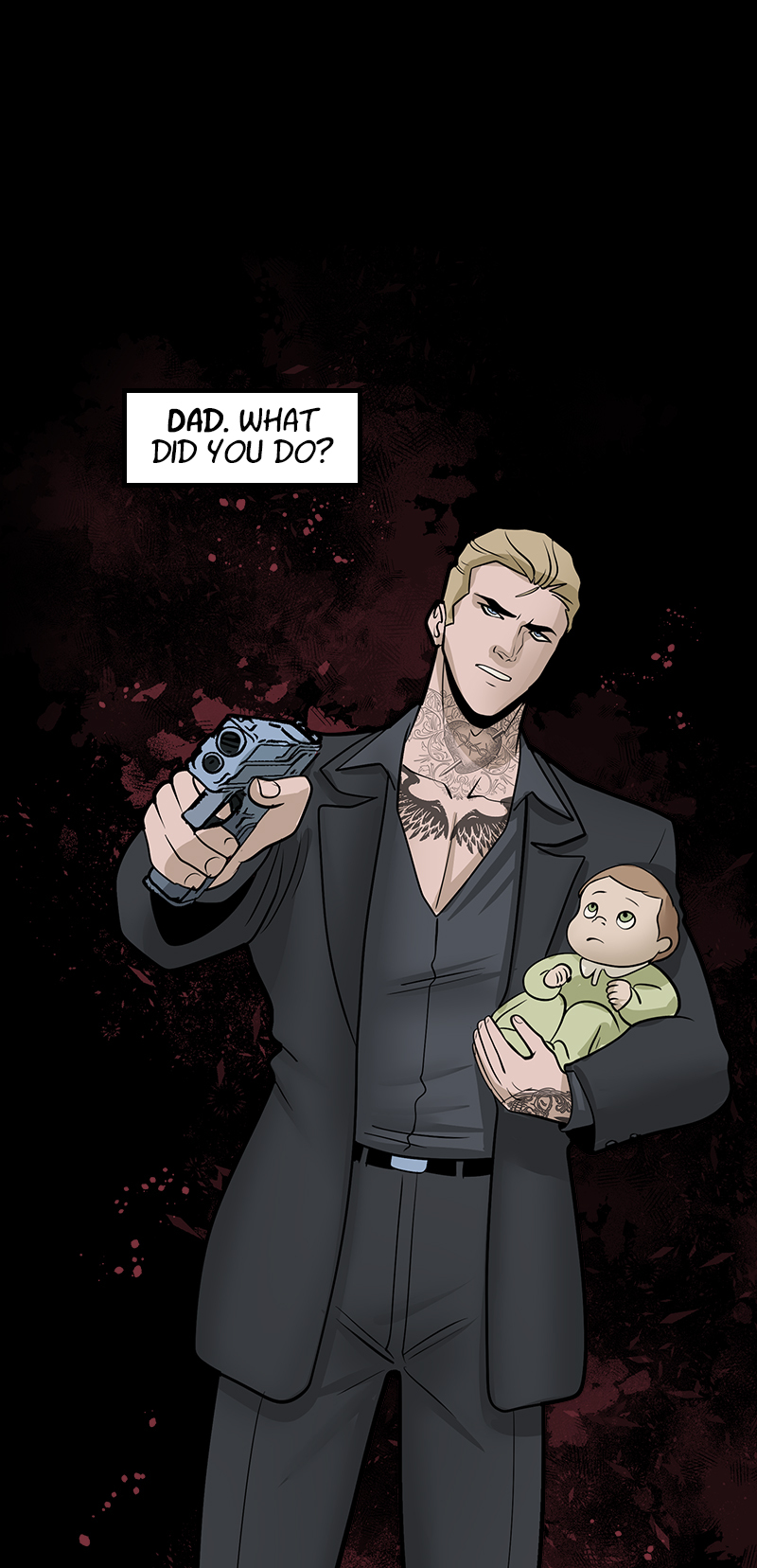 18+ only. NOT SUITABLE FOR SENSITIVE READERS. This is a DARK comic that romanticizes a morally gray and violent male lead. Themes include self-harm, violence, age gap, and sexual assault (not by the male lead.)