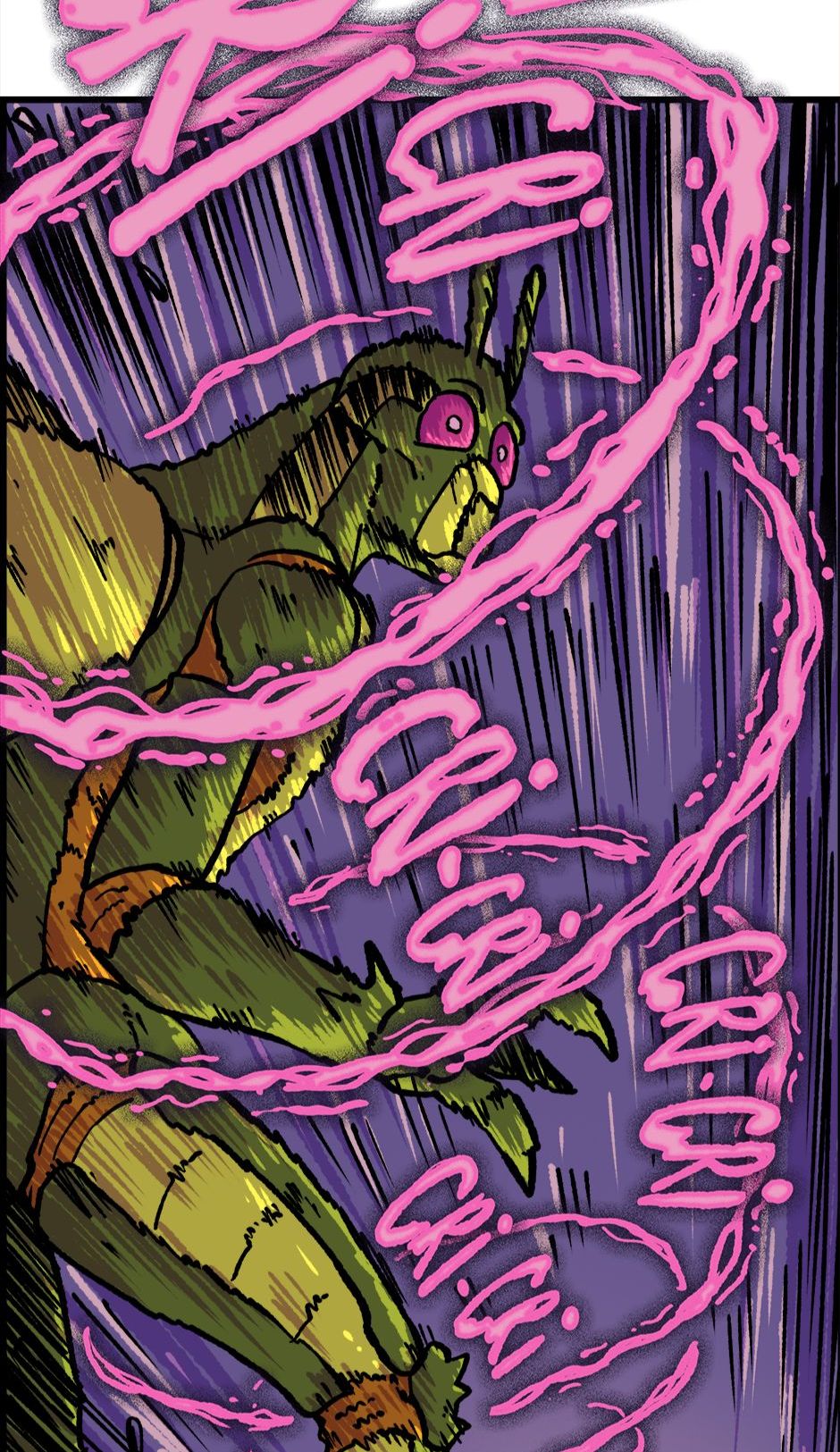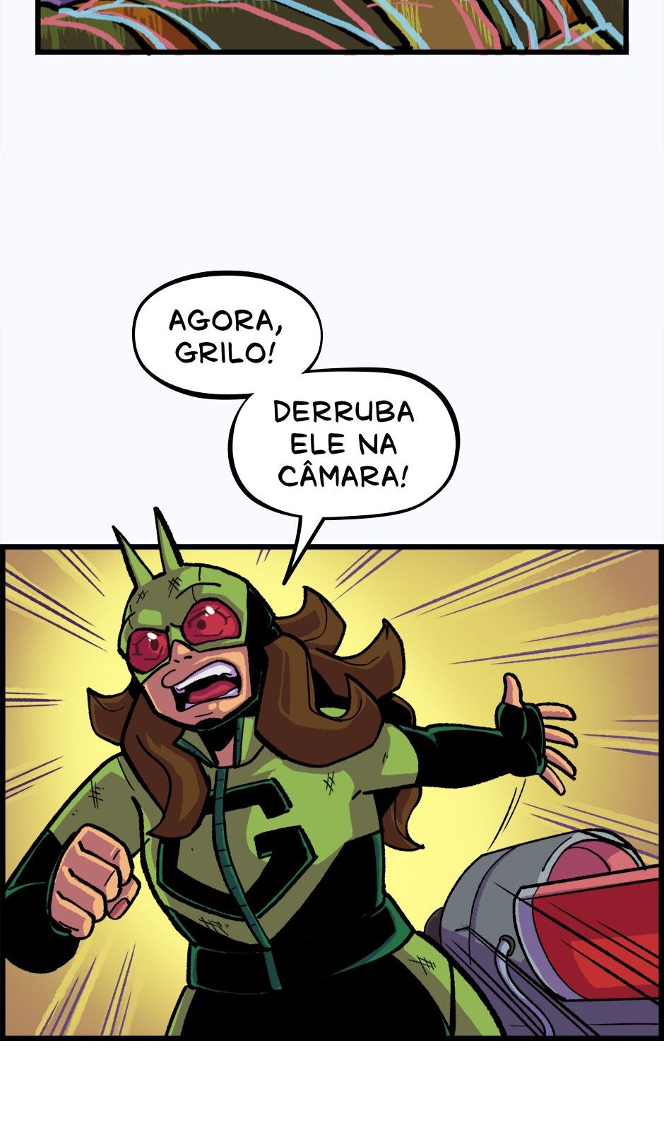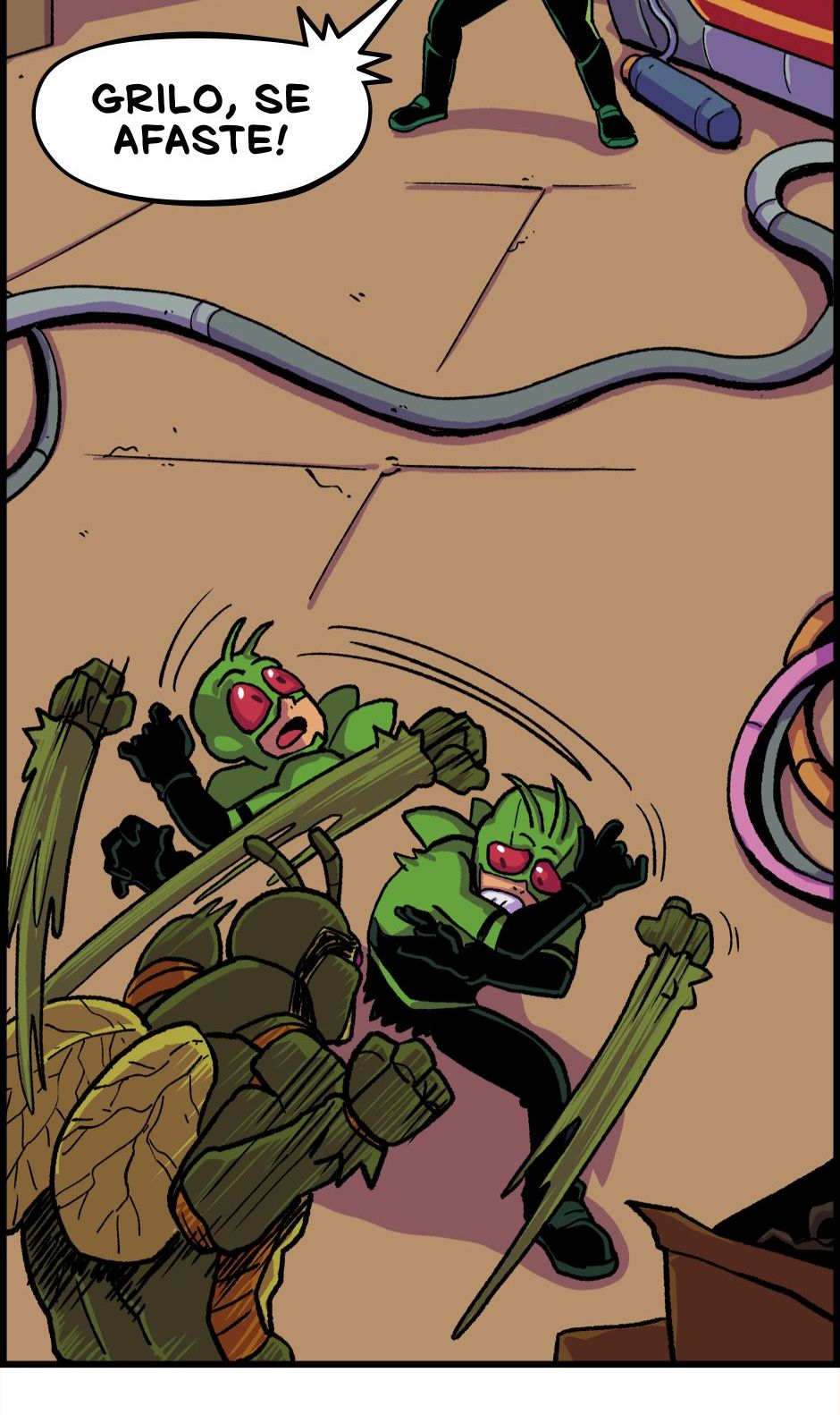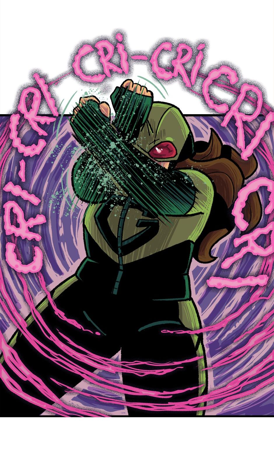 O Homem-Grilo e a Garota Cri-Cri armam um plano contra o Grilo-Humano. Roteiro e letras por Cadu Simões. Desenho e cores por Fred Hildebrand.