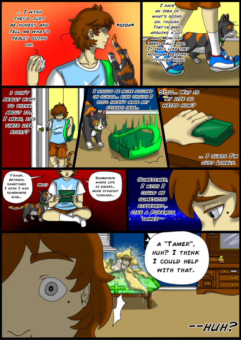 Sam is a 14-year-old human boy who accidentally makes a wish and ends up in the Pokemon world. Sounds trite, right? Well, it's not quite what he expected; the Pokemon are actually GIJINKAS! What's more, humans don't exist in this world, and everyone believes Sam is some sort of rare Pokemon, too! Now Sam must find a way back home, all while under the ever present eye of an evil demi-god who has plans of his own...