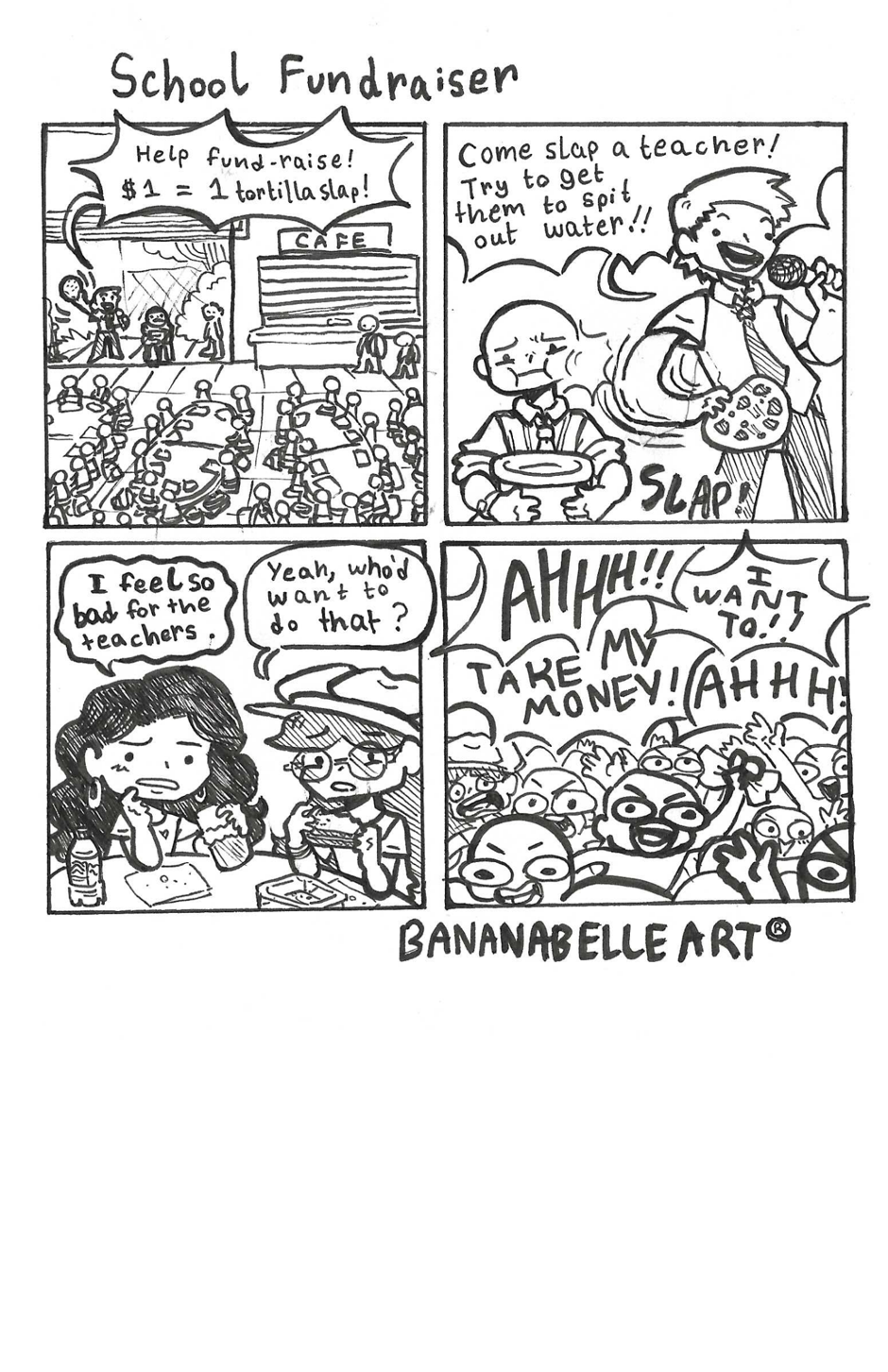 This one is dumb but a real thing that happened at my high school a few years ago. 😅 Although apparently I did not remember the details correctly, the friend I drew sitting with me was actually part of the club putting on the fundraiser. eh heh heh.