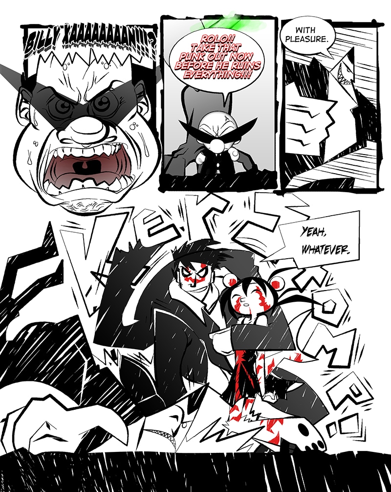 This chapter was originally done for San Diego Comic Con mag I did with some friends. I experimented a lot with art techniques with this story and even got to test some mixed media! In this story, Billy and Mirai must escape the clutches of the zombie hunting duo Ribs and Rolo!