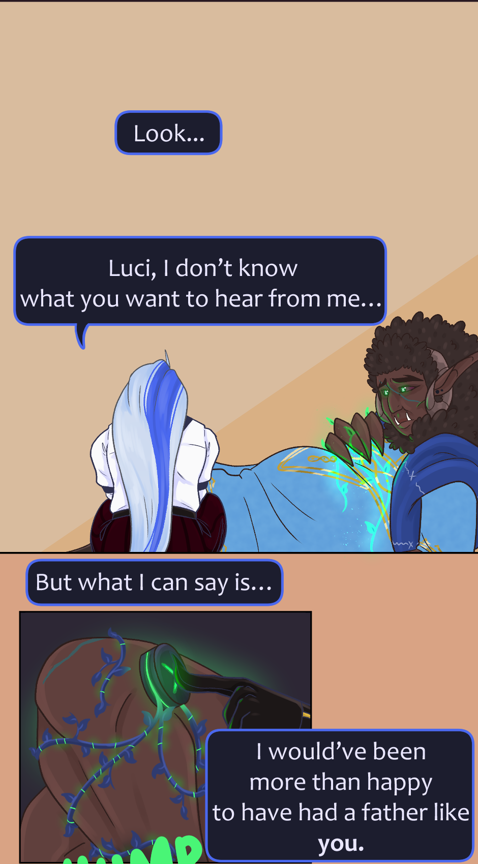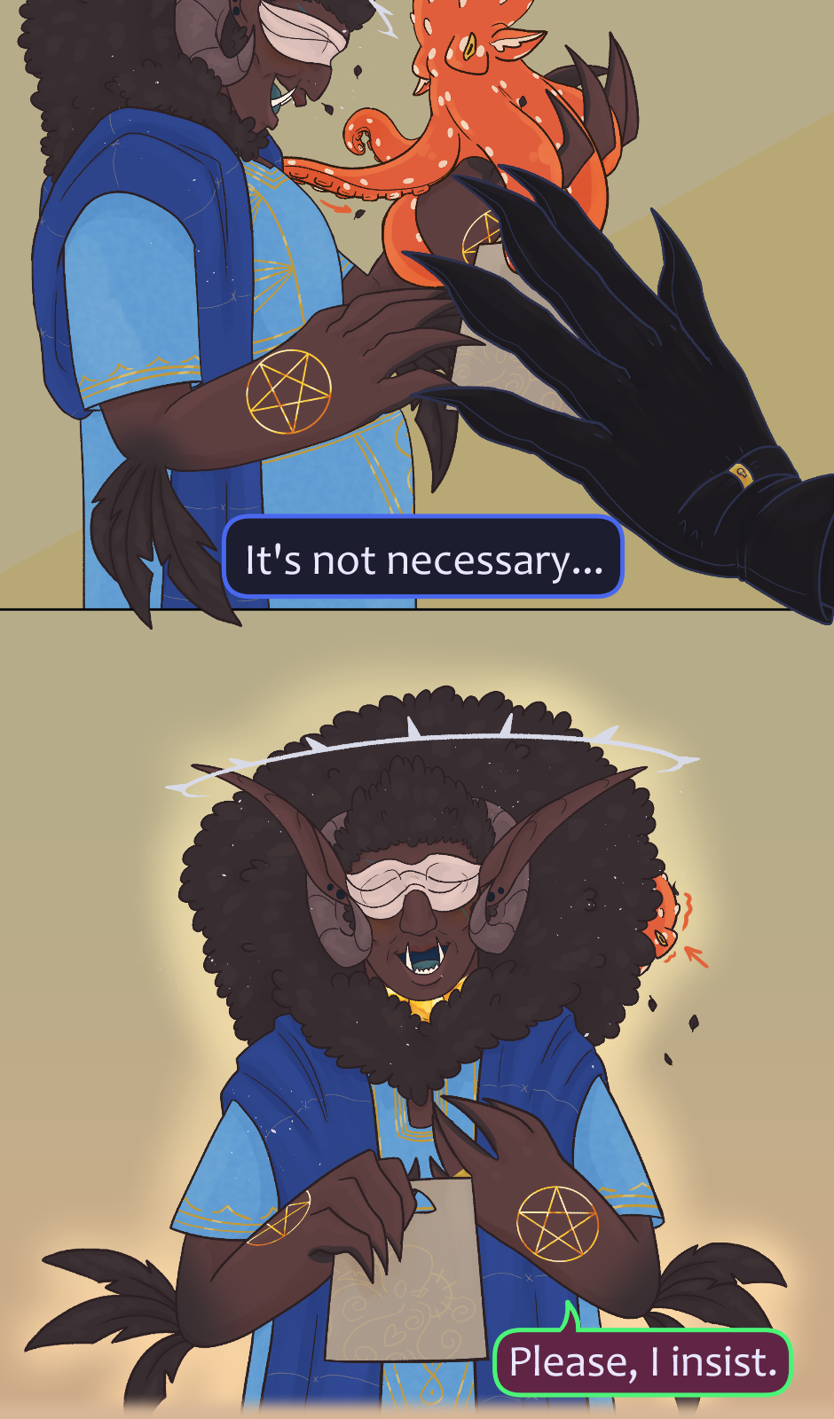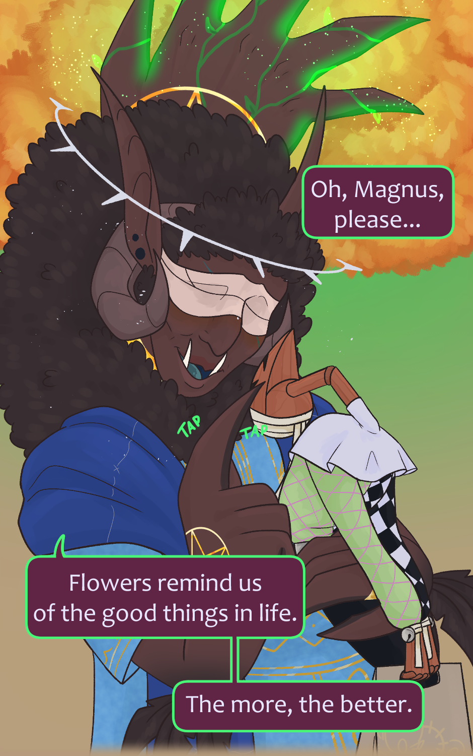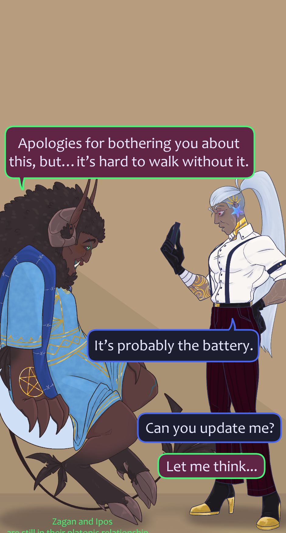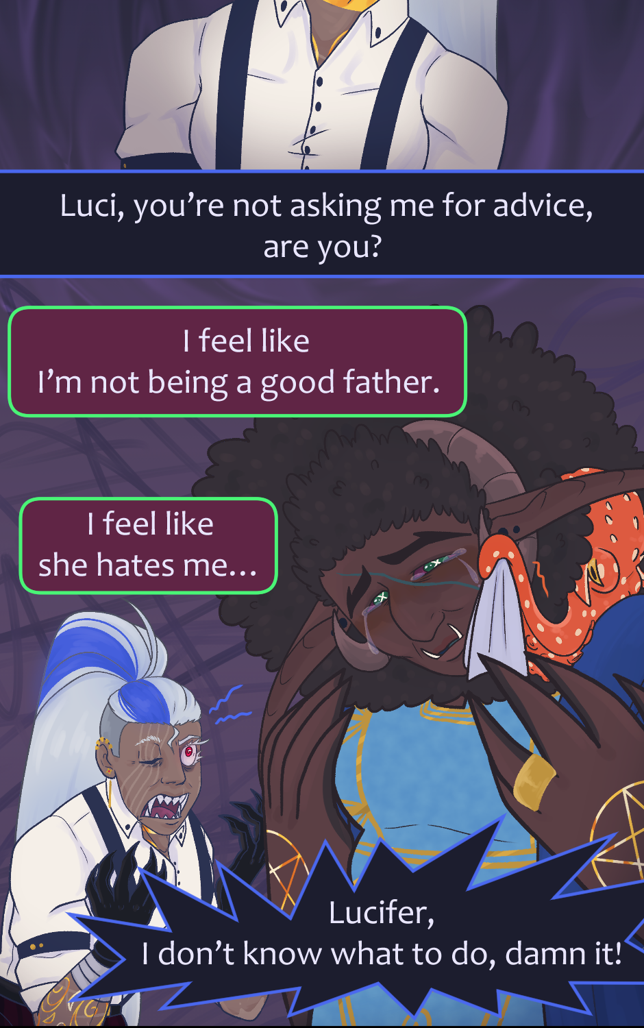 When the General of Hell, Lucifer, makes an unexpected visit to the King of the Arcanos, Magnus, seeking help with a simple orthosis repair, things take an unexpected turn. Amid casual conversation and moments of vulnerability, Lucifer finds himself revealing more than he expected about his insecurities, while Magnus reacts in a way no one could have predicted.