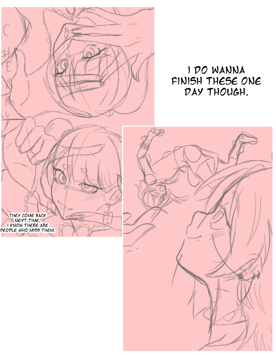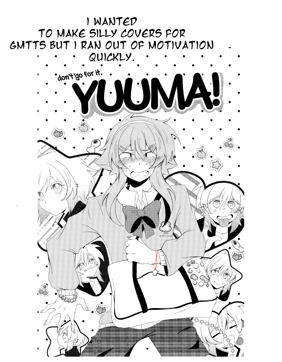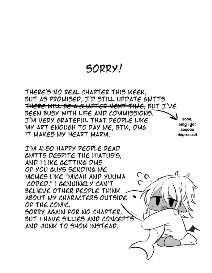I still want this to be fun. There have been times I've cried over how slow this is coming along, and how I can't meet deadlines like a real mangaka, but then I remember I'm not a real mangaka. I'm just a worm who wants to tell a story for fun. If I'm not having fun, then there's no point. But that would suck like crazy because we're only two chapters away from volume 2. This means, we're halfway done with gmtts!