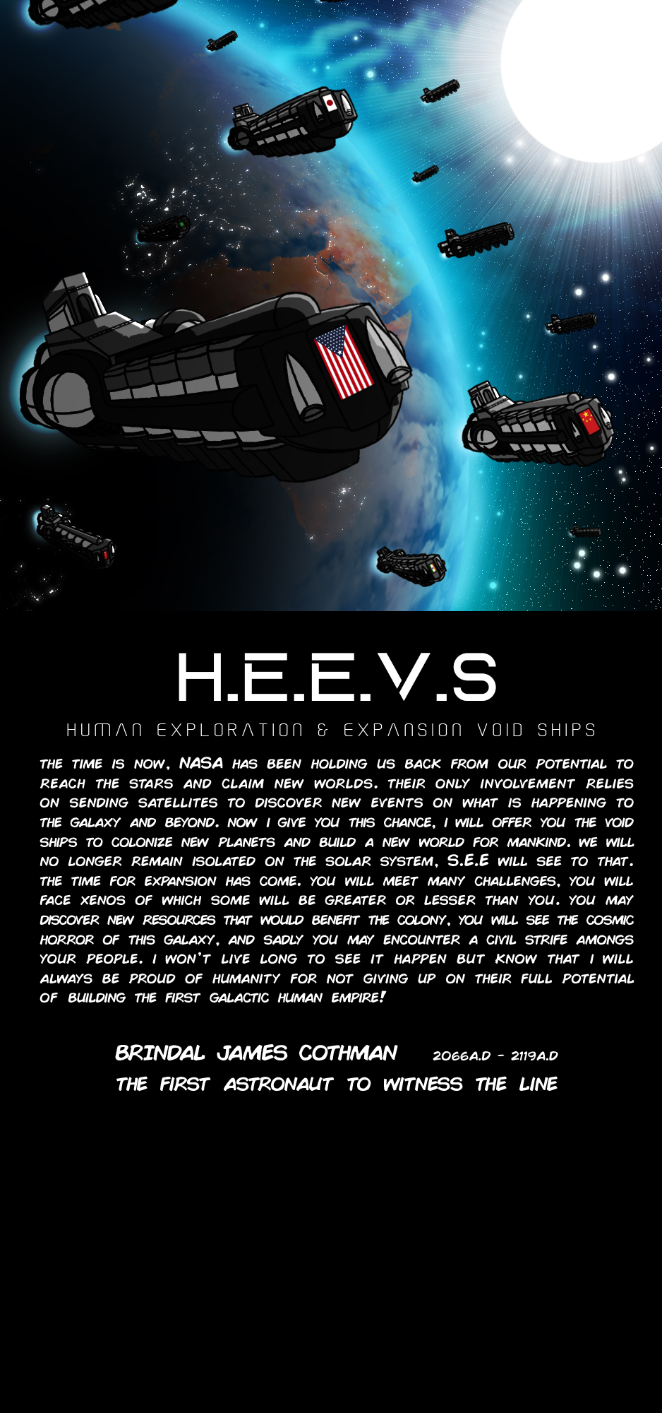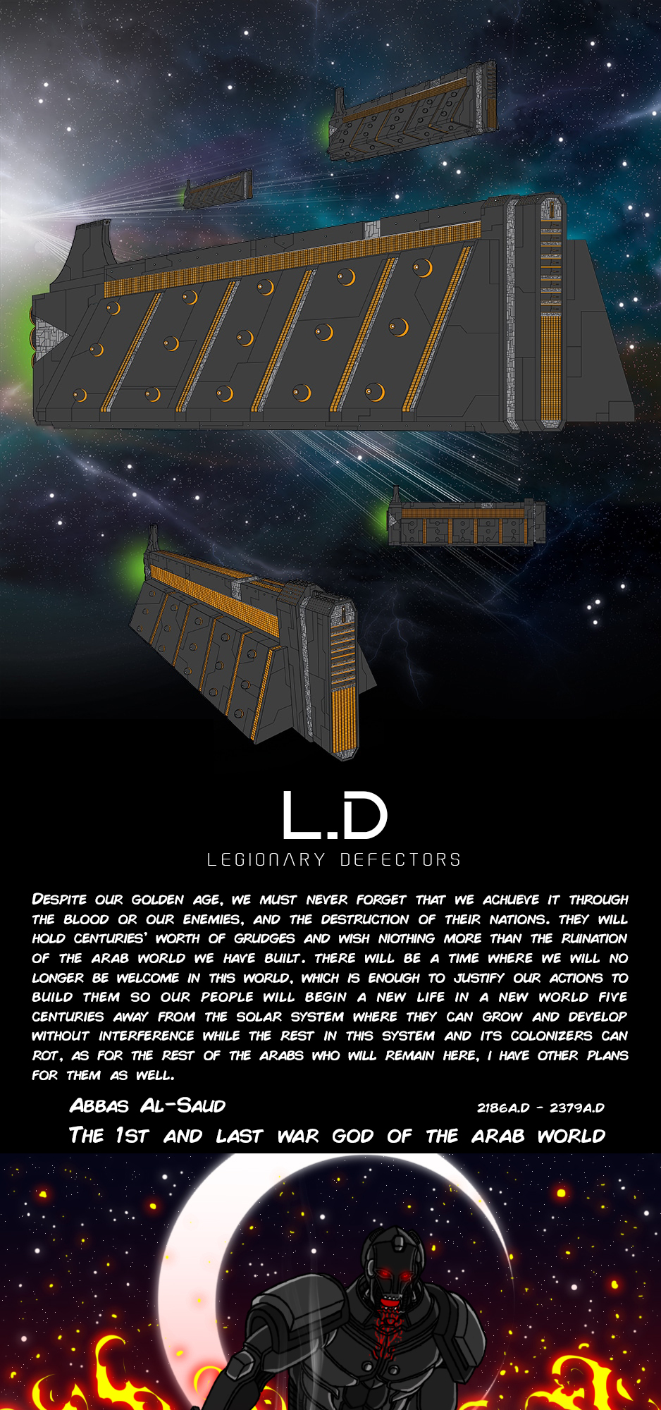 After the desolation on Earth caused by the final world war in the early 26th century, the Abbasians left earth with 500 million of its people on 5 titan void ships. Each carrying a hundred million to travel 600 light years away from the solar system to start and expand a new galactic empire.