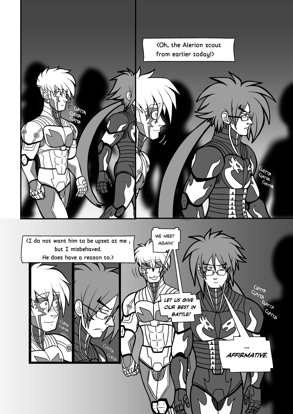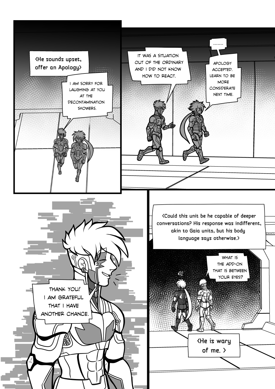 Crisanto is a cyborg soldier created to defend a newly stablished off-world colony. However, more than battles he yearns of companionship, concept that in his world is not embraced. Then he meets Brant, a cyborg who has just arrived from a scouting mission on Earth, and recently got transferred to the same base he is in. They get to know each other and their relationship develops.
