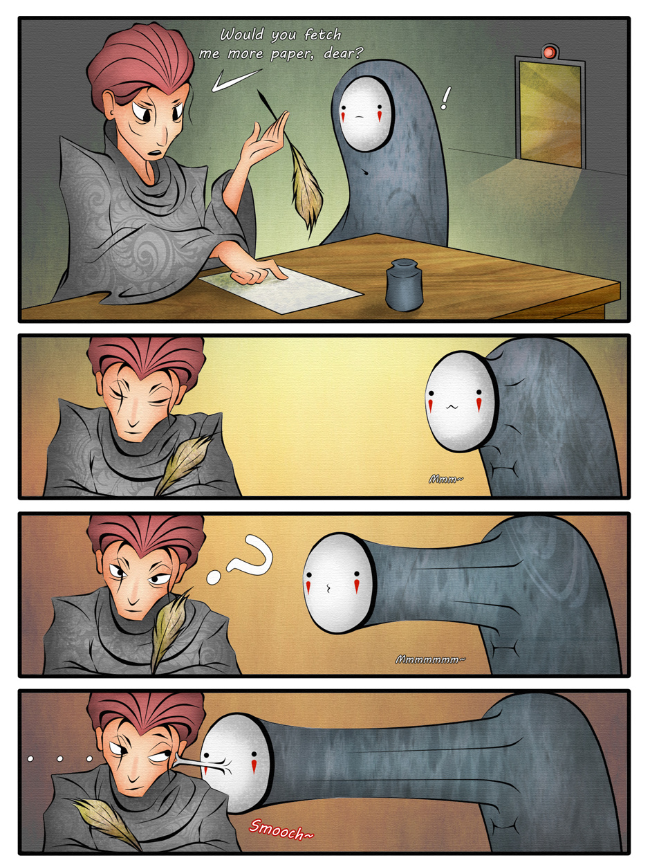 Yeah... Basically my comic will consist of mostly my human interpretations of animated characters... And here's a No-Face sneaking a kiss all up on that Dean Hardscrabble. Mmmmm~ get some No-Face!