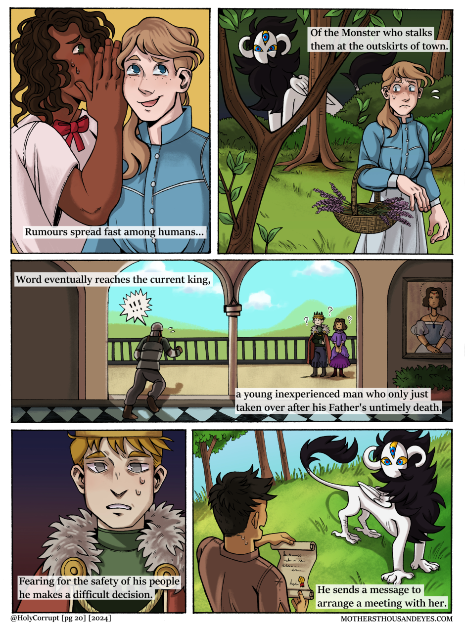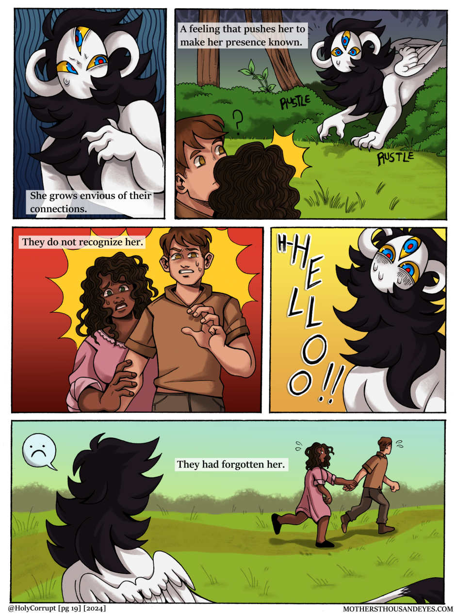 MOTHERS THOUSAND EYES (Or MTE for short) is a queer fantasy comic about a universe created by a young Goddess named MOTHER, and her children called 'Blessed' who are born into this world through humans. In this world, they are treated as items of worship until they age and grow into 'Corrupt' In which they are readily thrown away.
