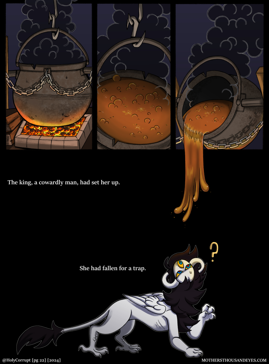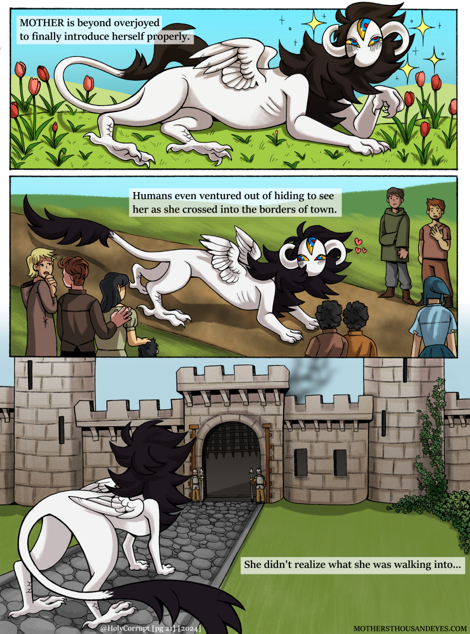 MOTHERS THOUSAND EYES (Or MTE for short) is a queer fantasy comic about a universe created by a young Goddess named MOTHER, and her children called 'Blessed' who are born into this world through humans. In this world, they are treated as items of worship until they age and grow into 'Corrupt' In which they are readily thrown away.