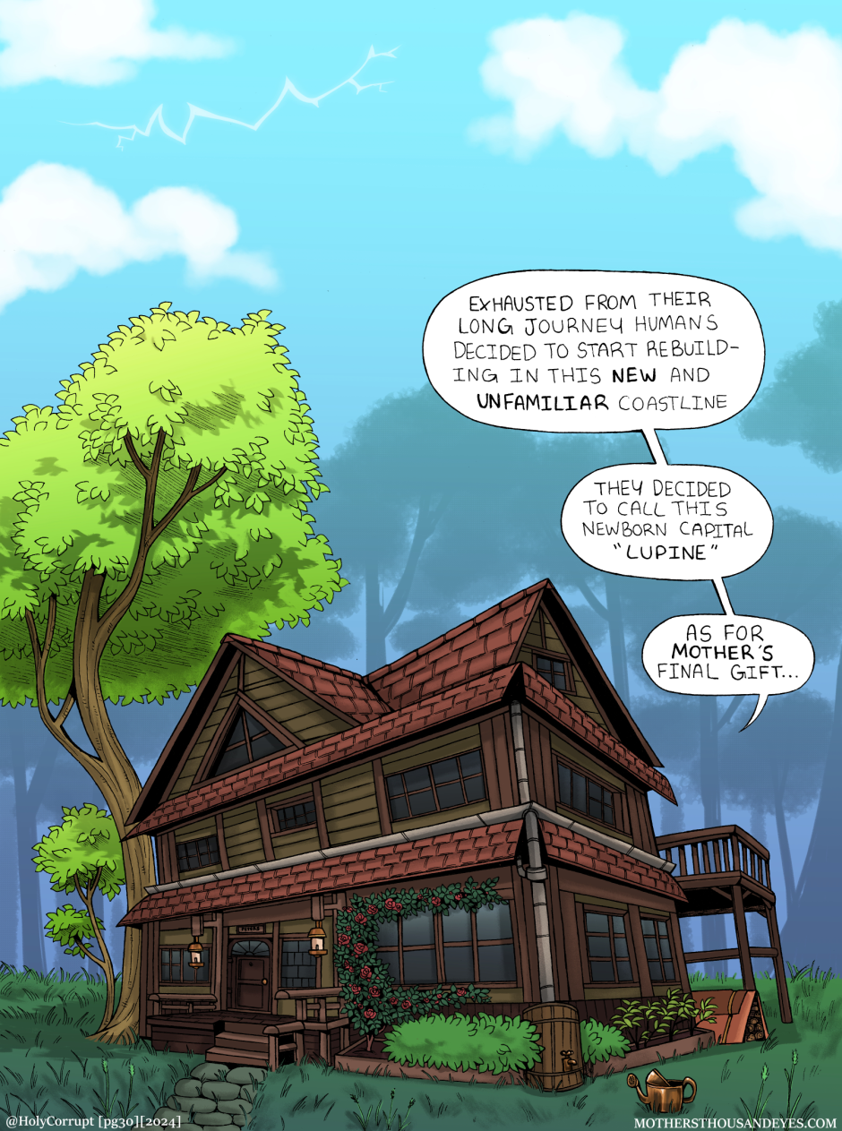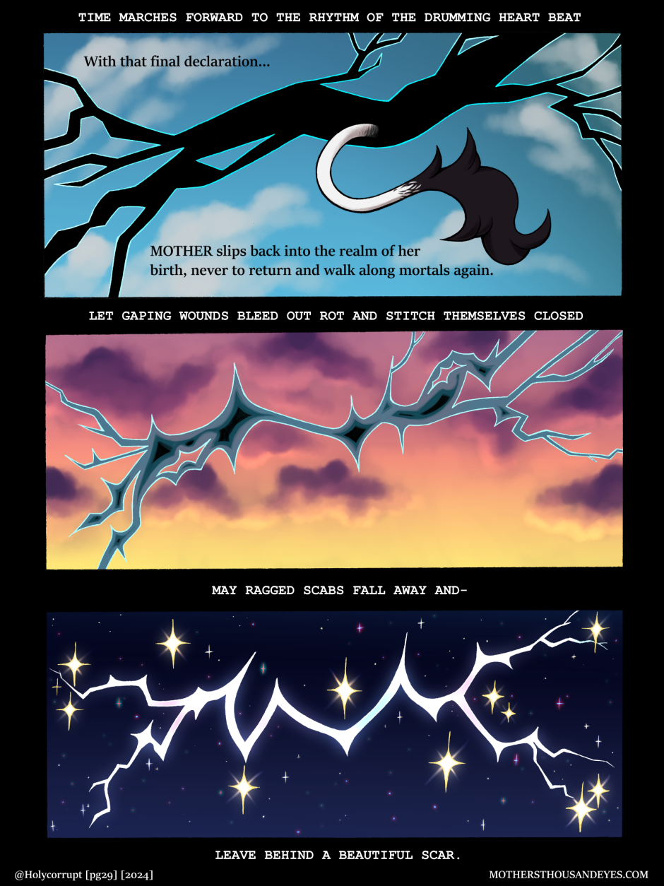 MOTHERS THOUSAND EYES (Or MTE for short) is a queer fantasy comic about a universe created by a young Goddess named MOTHER, and her children called 'Blessed' who are born into this world through humans. In this world, they are treated as items of worship until they age and grow into 'Corrupt' In which they are readily thrown away.