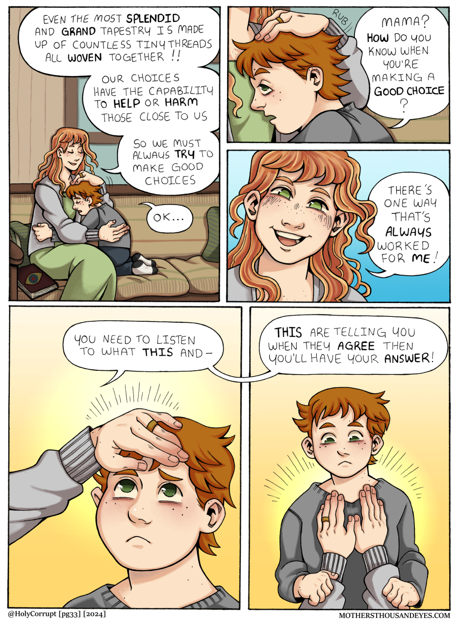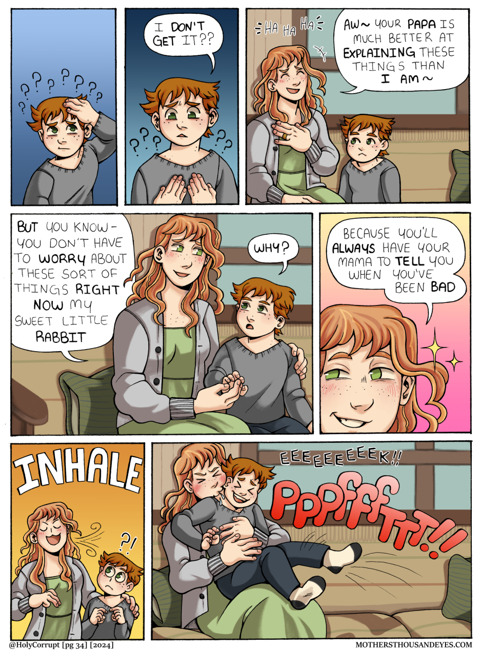 MOTHERS THOUSAND EYES (Or MTE for short) is a queer fantasy comic about a universe created by a young Goddess named MOTHER, and her children called 'Blessed' who are born into this world through humans. In this world, they are treated as items of worship until they age and grow into 'Corrupt' In which they are readily thrown away.