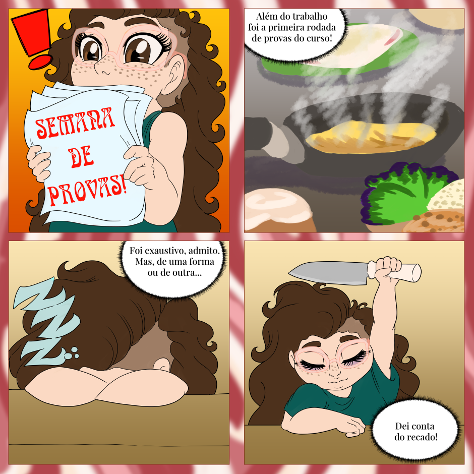 Meus relatos do meu curso de Gastronomia e do meu trabalho enquanto confeiteira, em tirinhas semanais feitas de 2022 a 2024. Postagem Original (Instagram): https://www.instagram.com/p/CdoUx4Vu2pj/ Postagem Original (Site): https://iridium-art.com/2022/05/16/bocados-de-brigadeiro-007/ Meu Instagram: https://www.instagram.com/iridium.fernandanoronha/