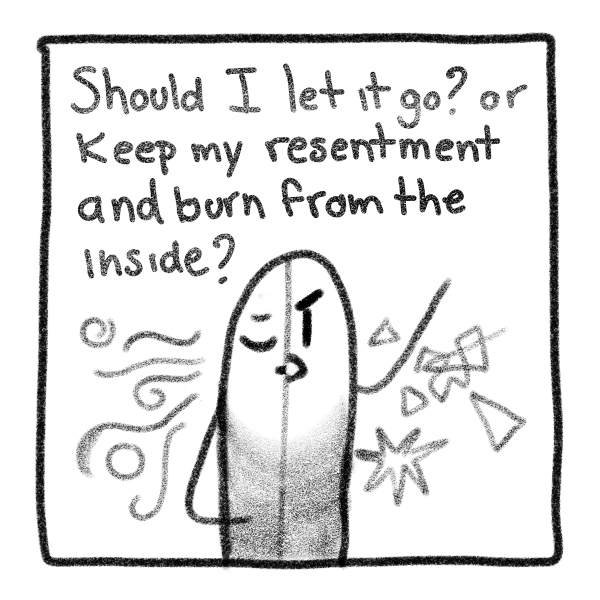 Letting go is the same as forgiving them? Then I should hold that grudge, but if that only hurts me and not them, what should I do now? What do I do now?