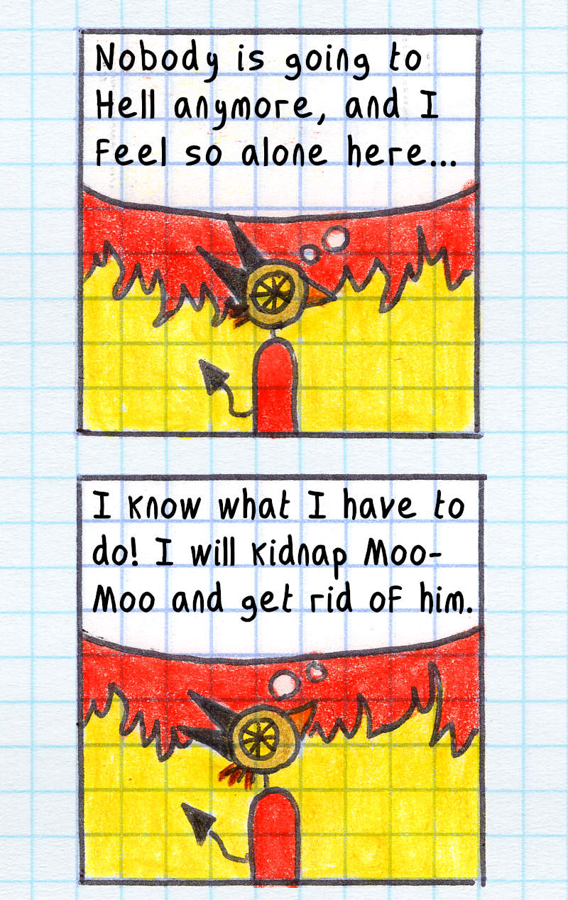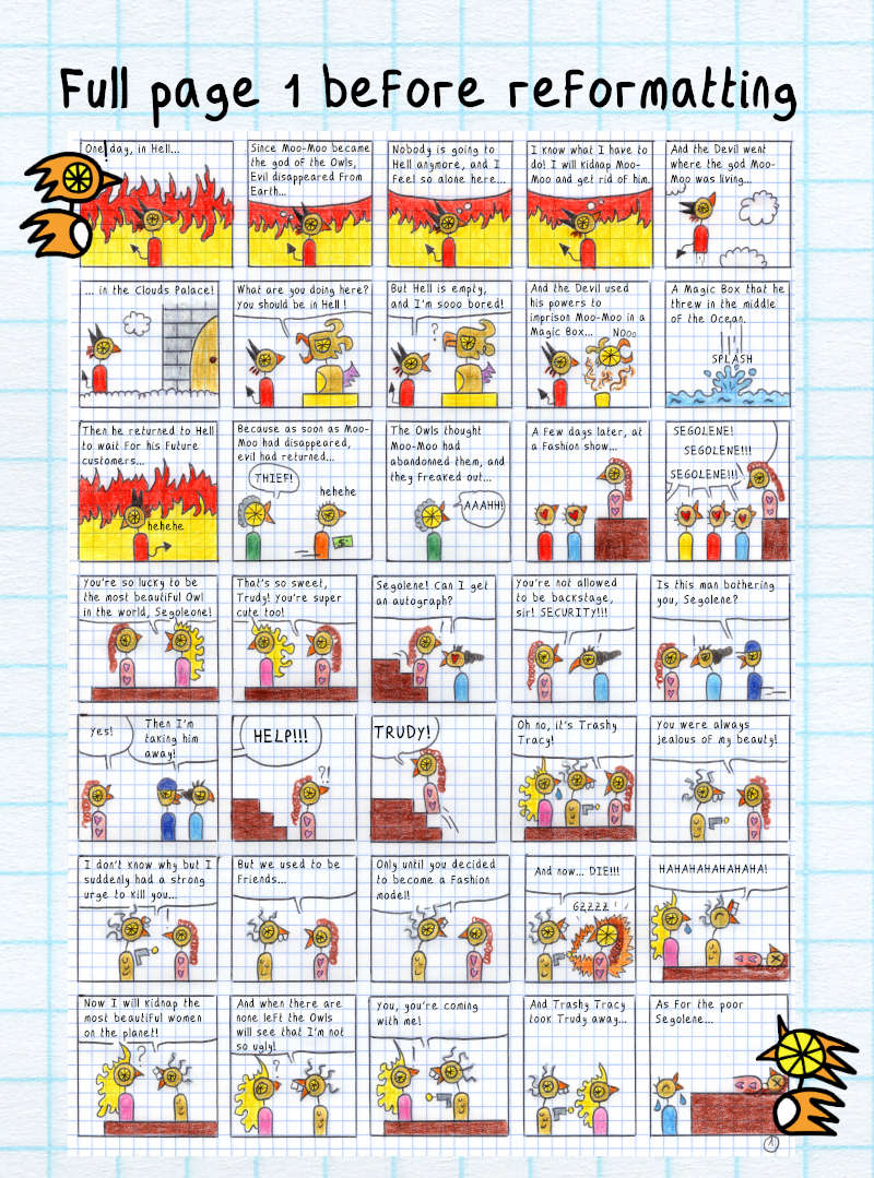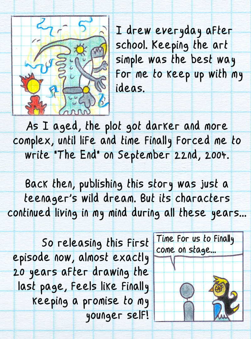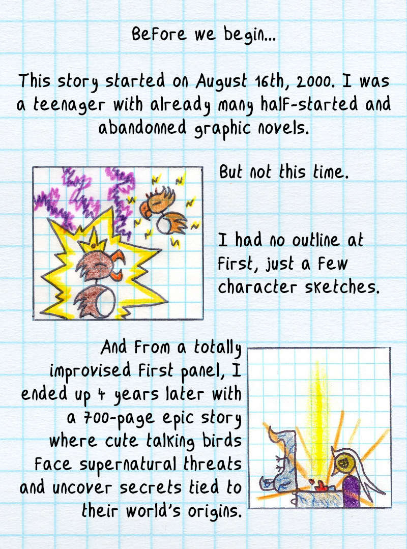 I had no idea what would happen after I drew the first panel on August 16th, 2000. I had no outline, just a few character sketches. Discovering the story as I went, without going back or editing, was a lot of fun! But as the story progressed, I started planning ahead—first a few panels, and eventually entire story arcs of around 100 pages.