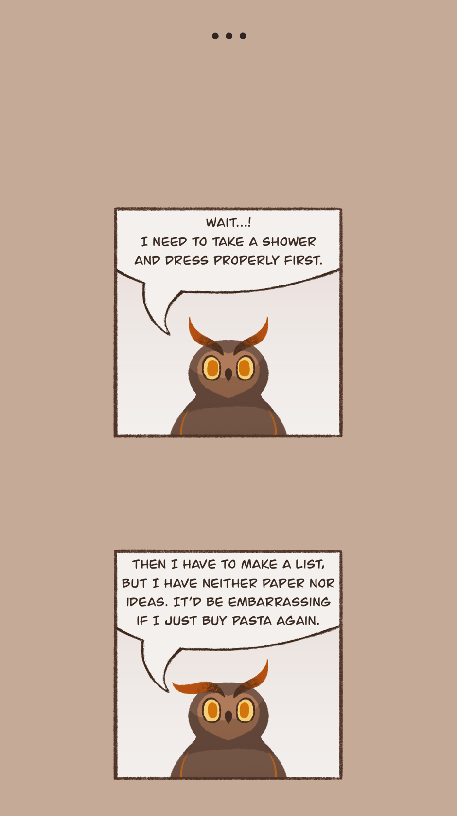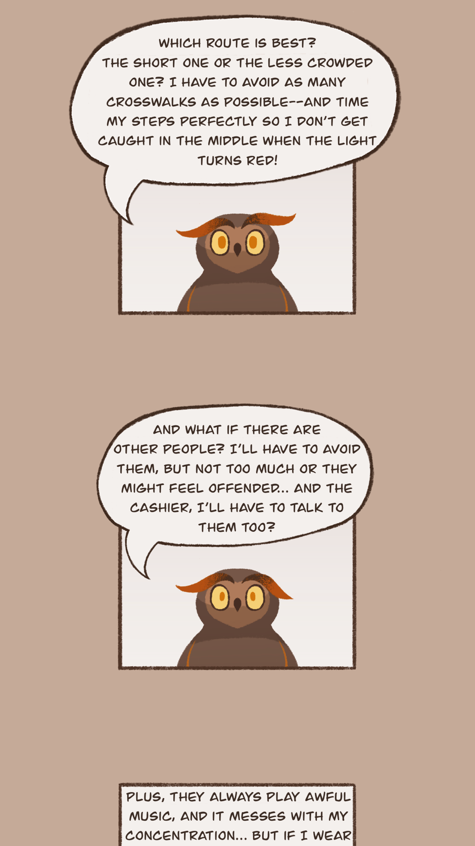 An owl crippled by anxiety tries to survive his daily misadventures. This is a lighthearted series that I draw on my free time to unwind and it shouldn't be taken too seriously. I know it isn't very original but I thought it'd fun and somehow relatable (I hope!).