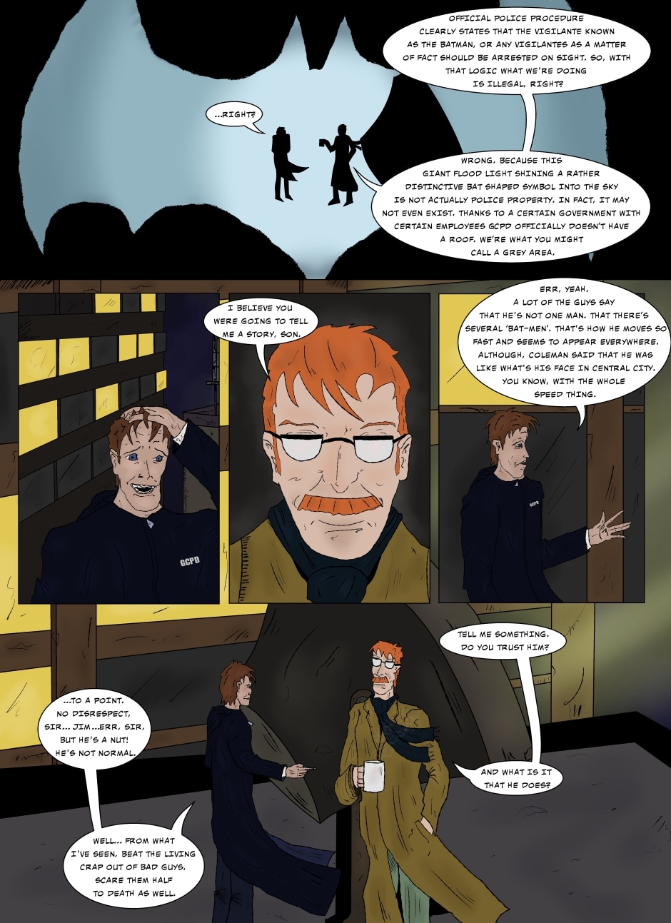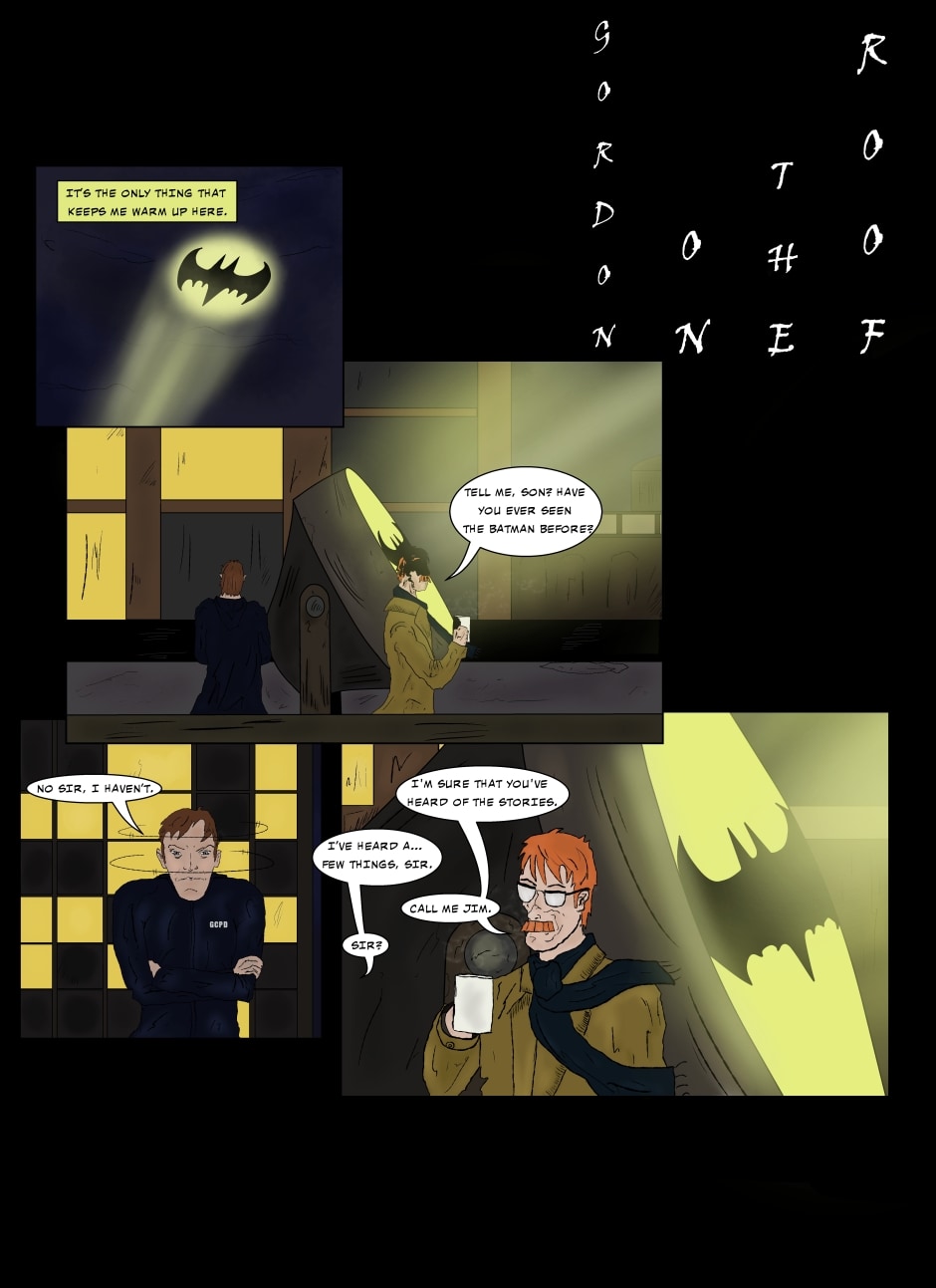 Once again Commissioner Gordon is on top of the GCPD roof waiting next to the infamous bat signal, but this time, he isn't alone. Young officer Jenkins, who has a rather negative view of the Dark Knight joins him. It's up here that Jenkins begins to learn the true meaning of Batman and why this city needs him.