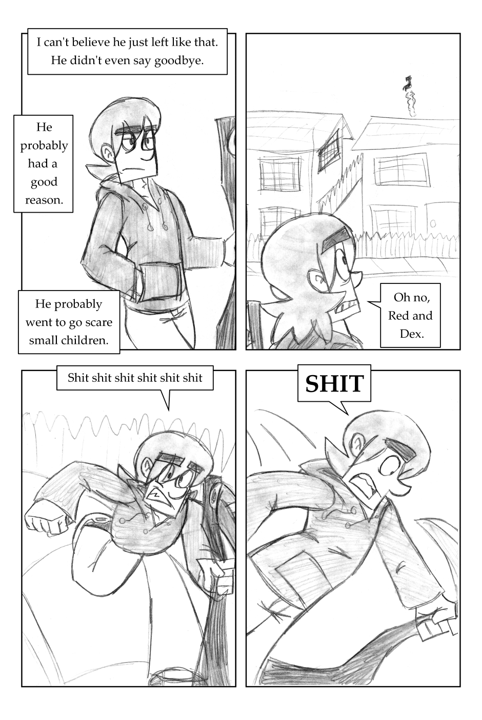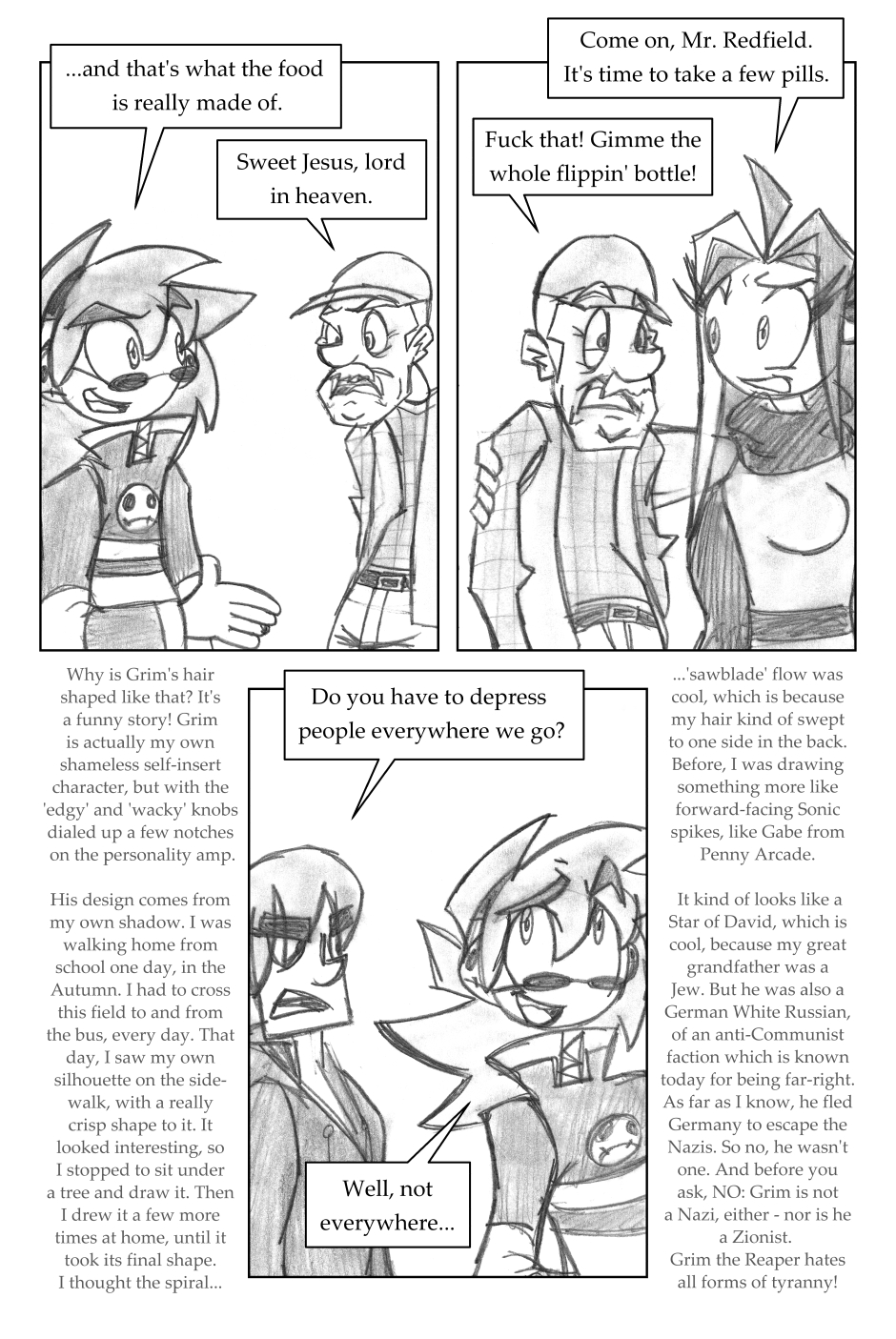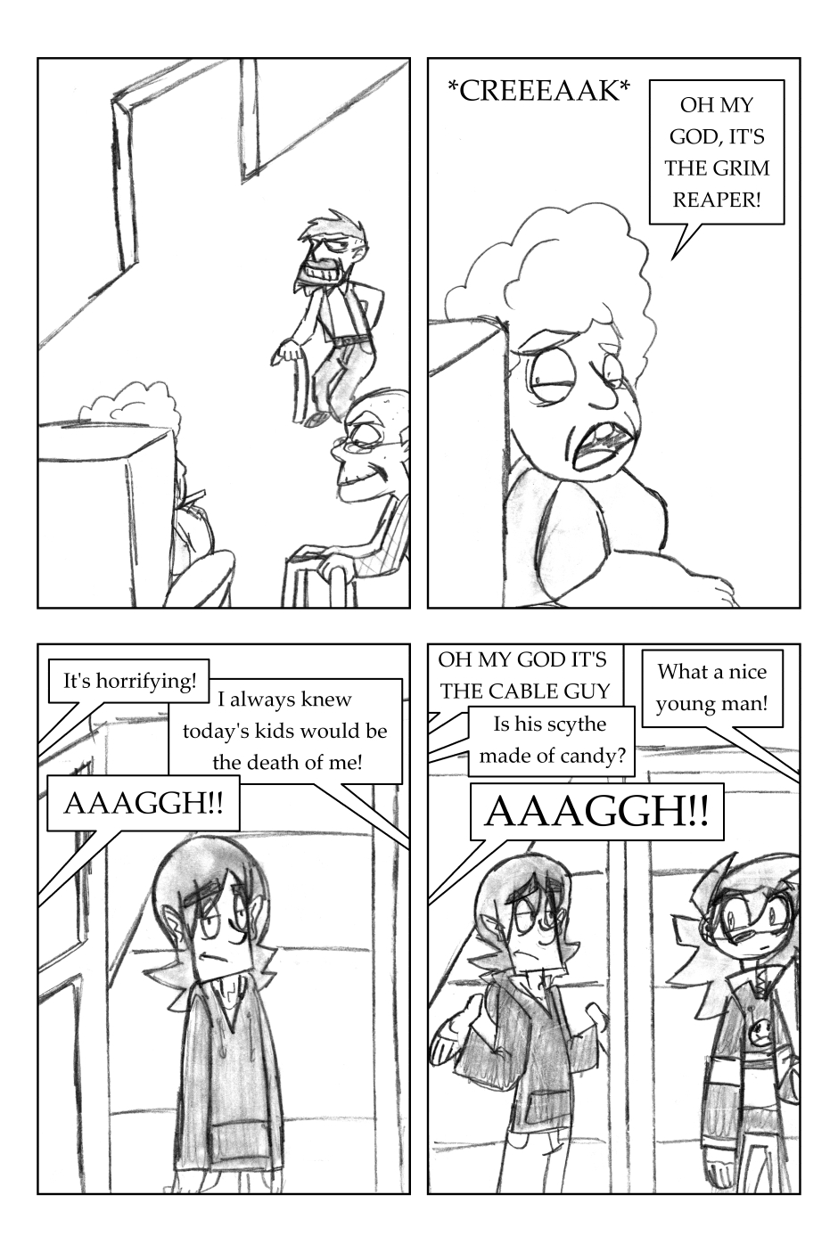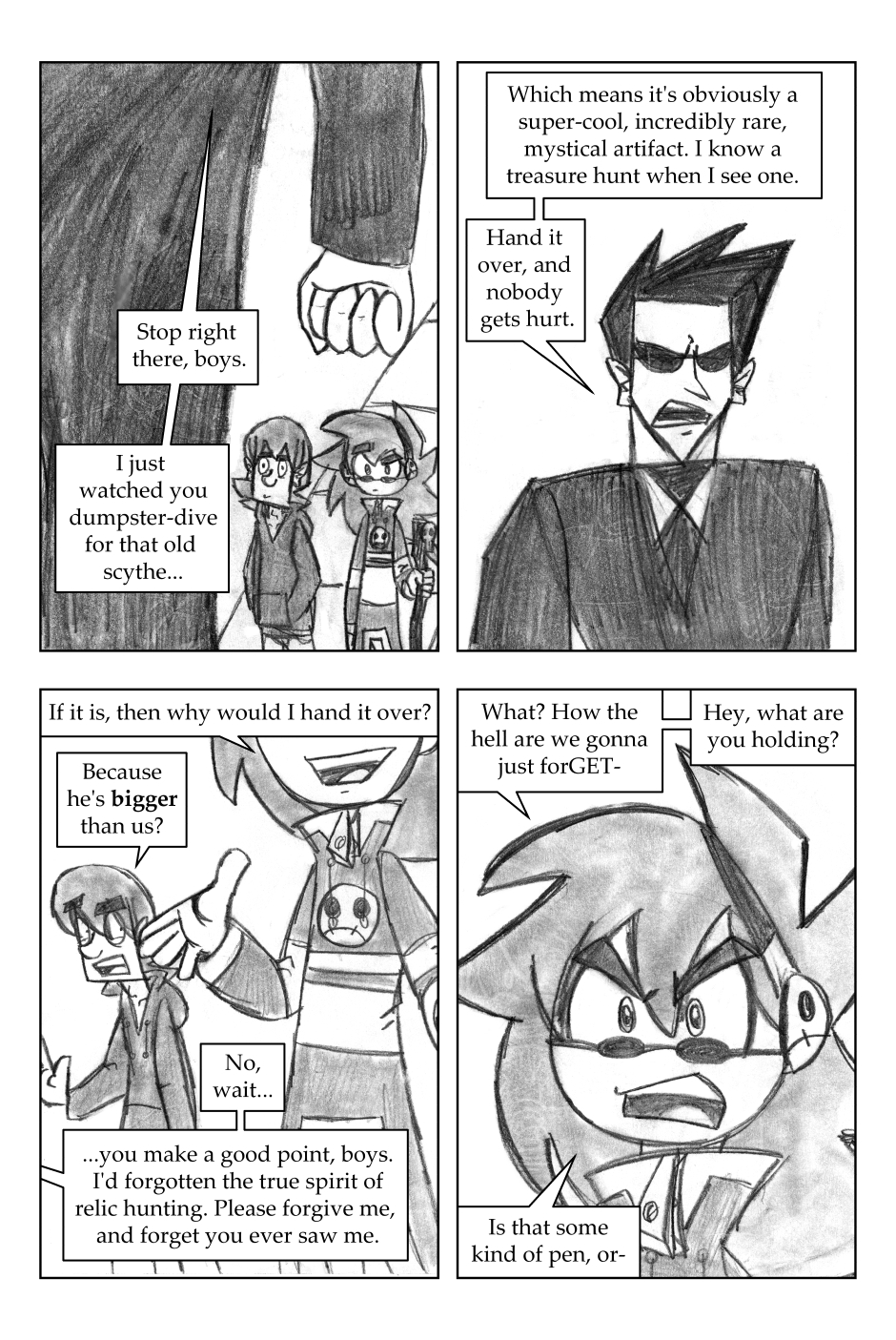 I was 12 years old when I drew this, where it all began! For this one, I'd started going down one path plotwise (the secret agent wanting the scythe) and then changed my mind. I figured it'd be funnier to leave it in, and make a joke out of it.