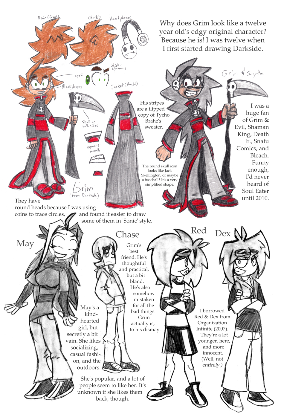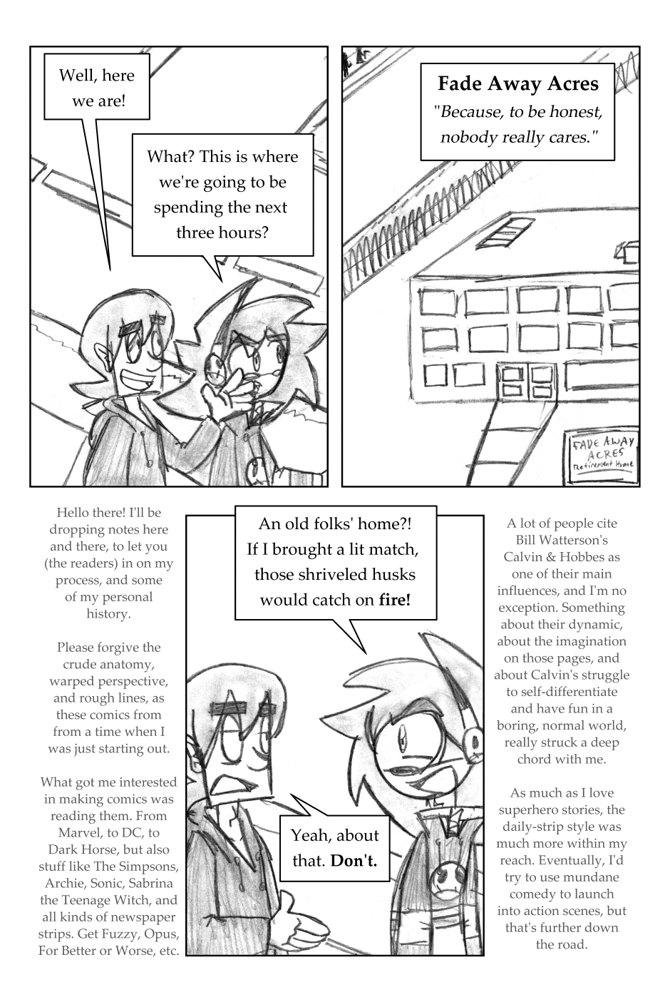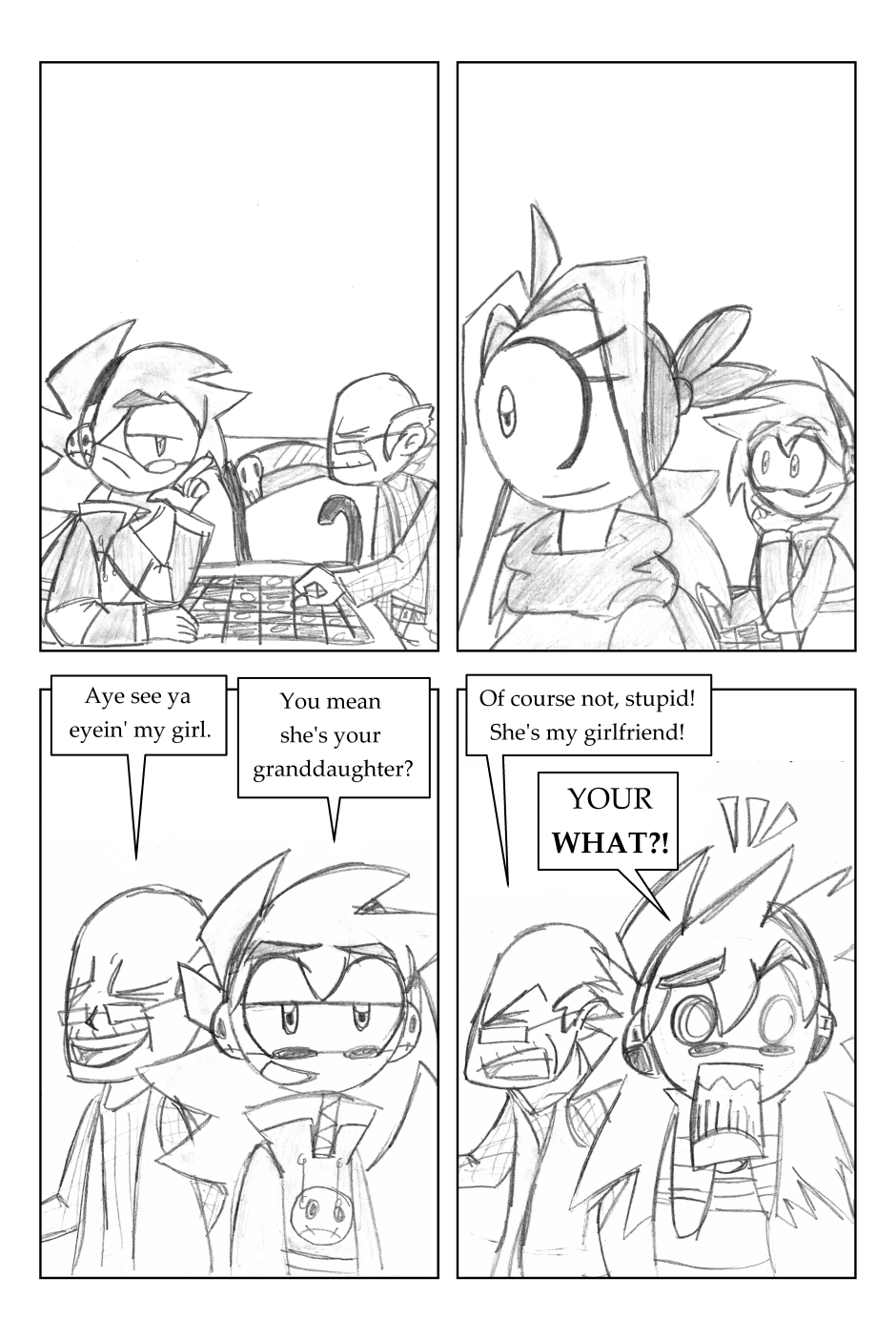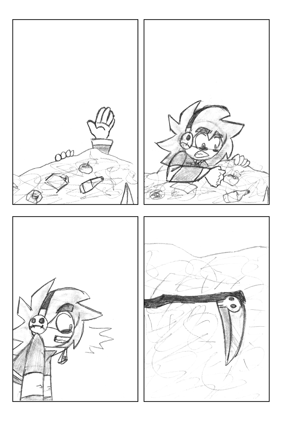 I was 12 years old when I drew this, where it all began! For this one, I'd started going down one path plotwise (the secret agent wanting the scythe) and then changed my mind. I figured it'd be funnier to leave it in, and make a joke out of it.