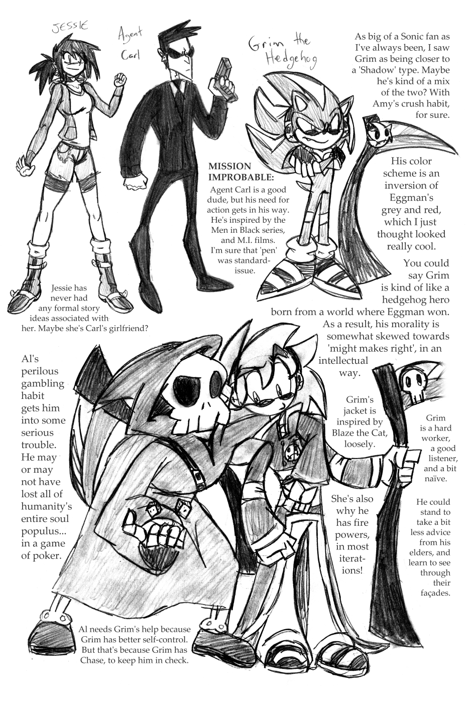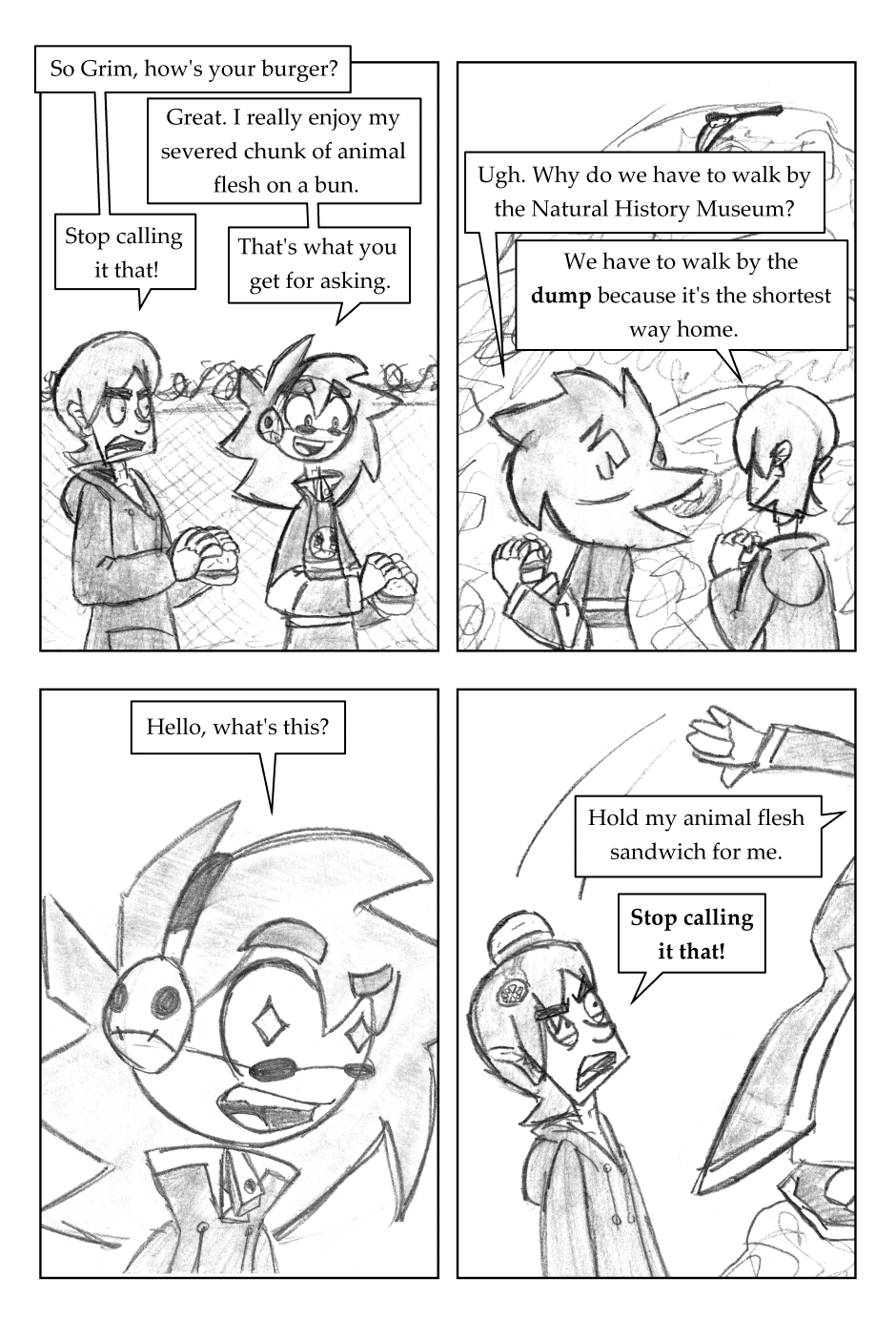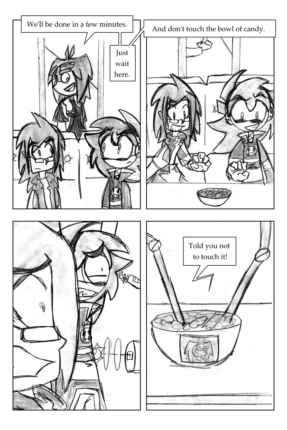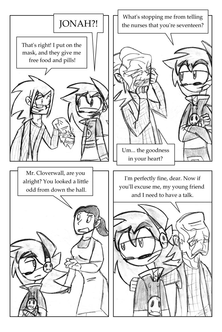 I was 12 years old when I drew this, where it all began! For this one, I'd started going down one path plotwise (the secret agent wanting the scythe) and then changed my mind. I figured it'd be funnier to leave it in, and make a joke out of it.