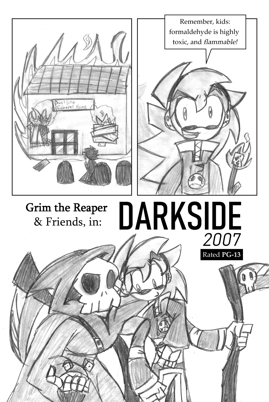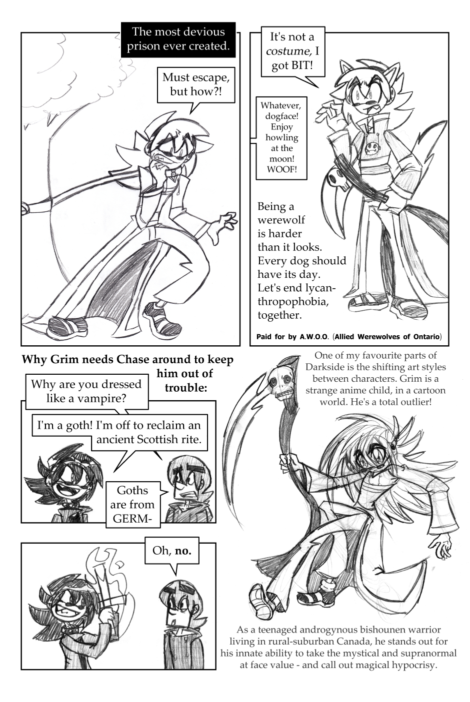 In an alternate dimension, Grim and his friends are continuously reborn to battle supernatural forces throughout the ages. Between crazy superpowers, tense rivalries, and sinister villains to fight, they've got a lot on their hands. A collection of half-finished comics (some that are seemingly unrelated), and various concept art with author's commentary. [Rated 14A]