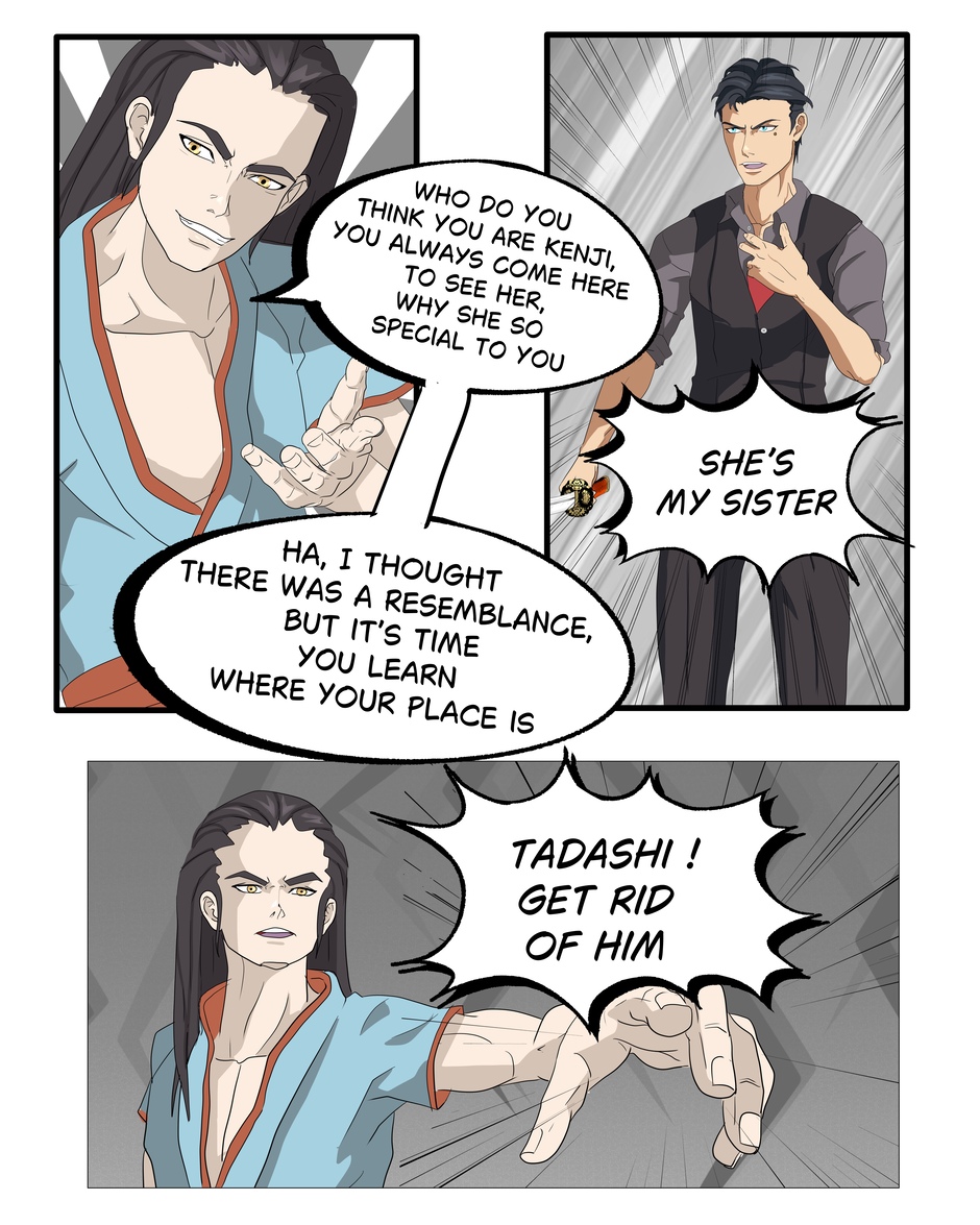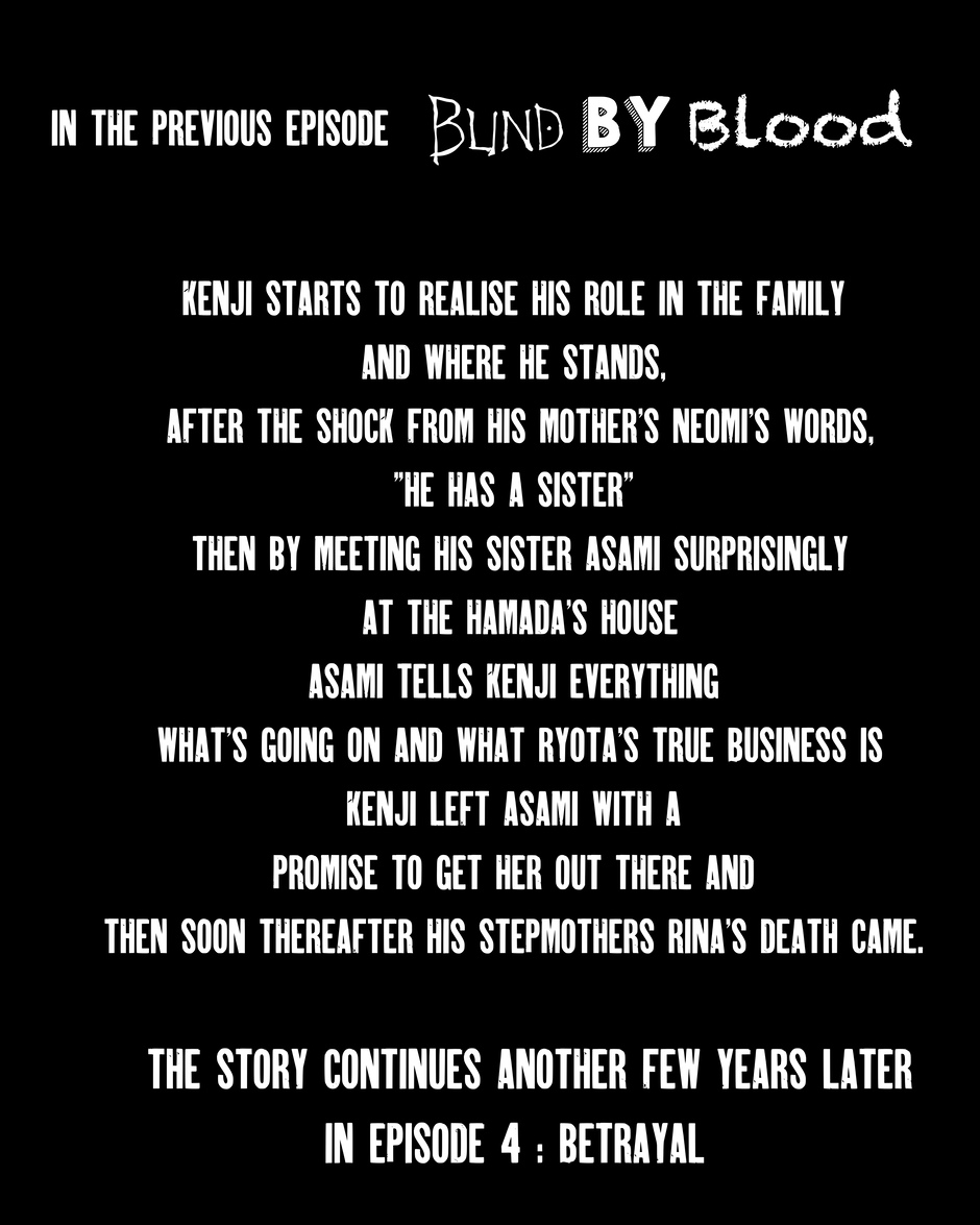 Blind by Blood, is about a boy named “ Kenji “who came from a tough life, living most of his life on the streets and got taken in by a well-known gangster family, the “ Tosokawa “ family, he grew up with his stepbrother “ Shin, but neither less Kenji didn't know that the leader of the Tosokawa gang “ Ryota “ was just using him and training him to do all Shins dirty work and to protect him. However, there are other secrets Ryota is hiding from the family that Kenji will soon discover about Ryotas's real business and his own family that got involved with Ryota.