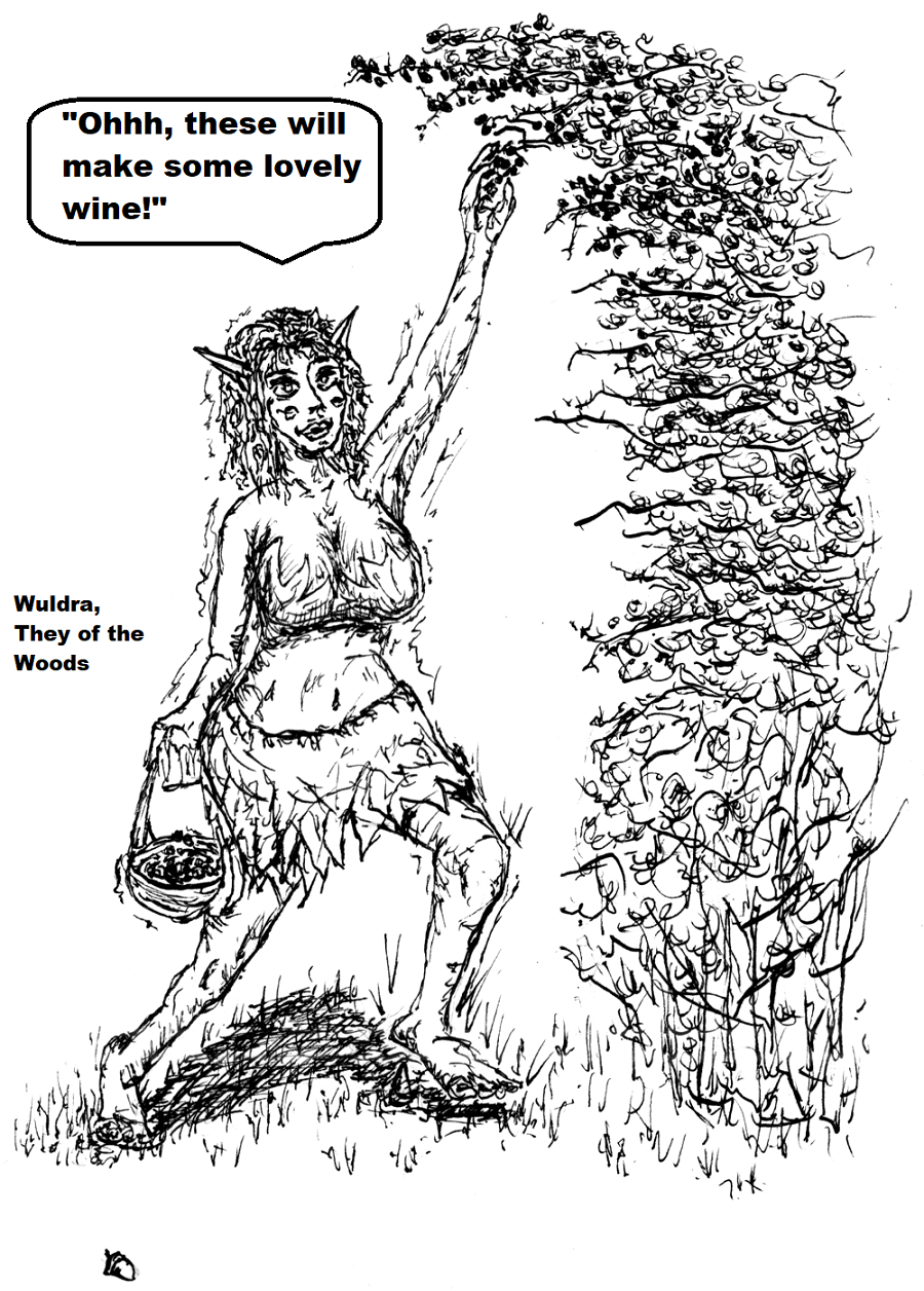 In which Wuldra, a Wildfey of They of the Woods who resides at Morgaine's stead, ventures into the woods in search of sloe berries to make delicious wine.