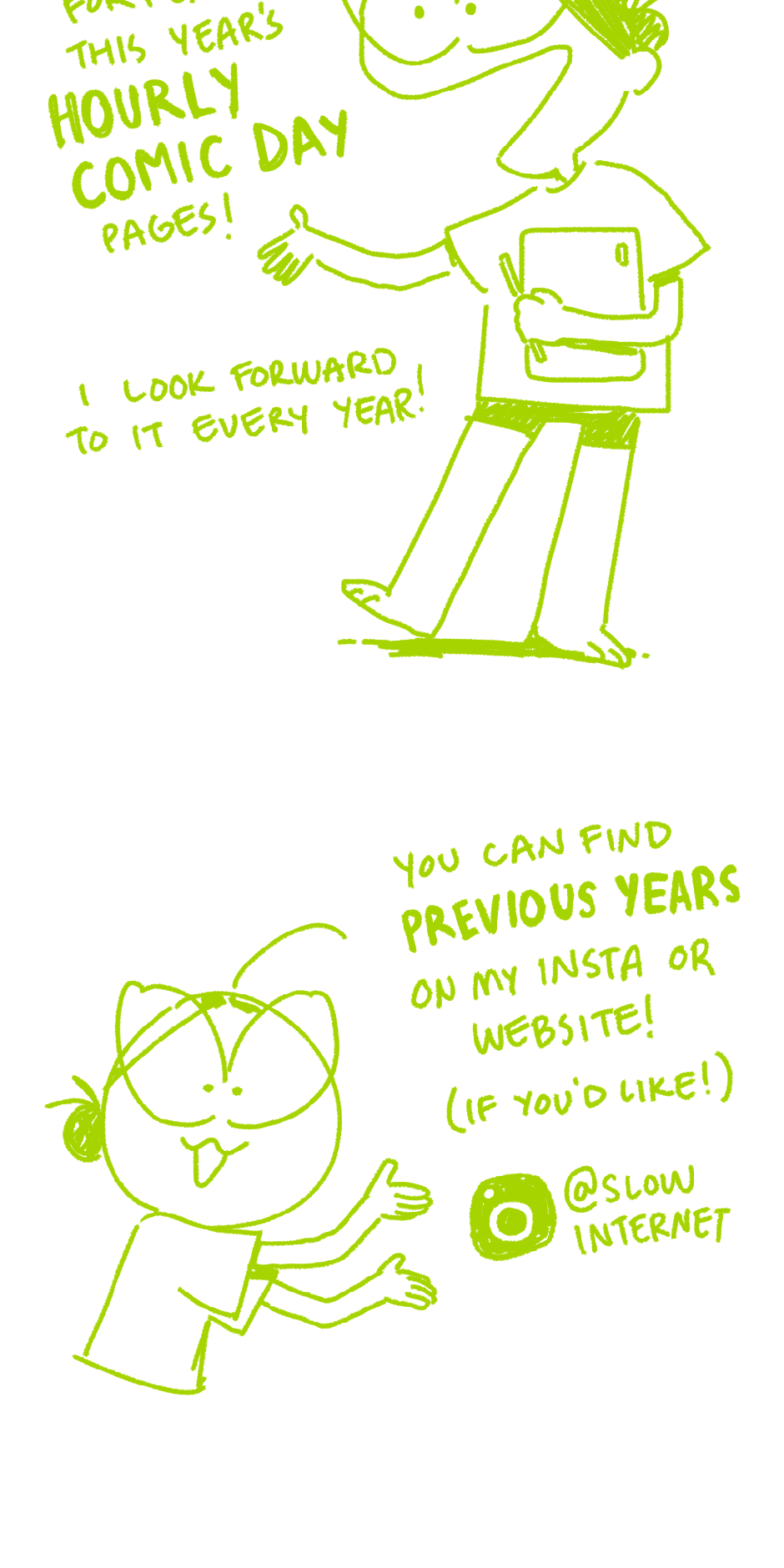 This year's Hourly Comic Day pages! It's my 4th year participating, but the first that I'm actually...... doing something on that day....... Here's the link to my previous years' comics! https://lauren-lee.wixsite.com/story/comics LINKS! ◆ sloint.carrd.co/ ◆ www.instagram.com/slowinternet/