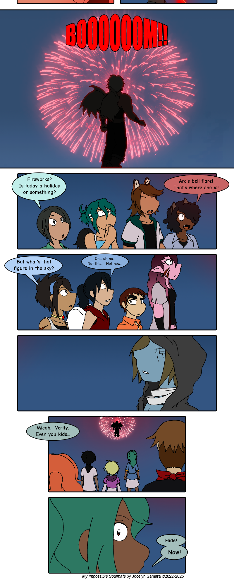 He's flown away, but Arc knows her teammates are out there. The sky is pretty dark tonight. Would they even know he's there, lurking and ready to strike? Thanks to that flare lighting up the sky, he's pretty easy to spot now, and it gives her friends a means of finding her too.