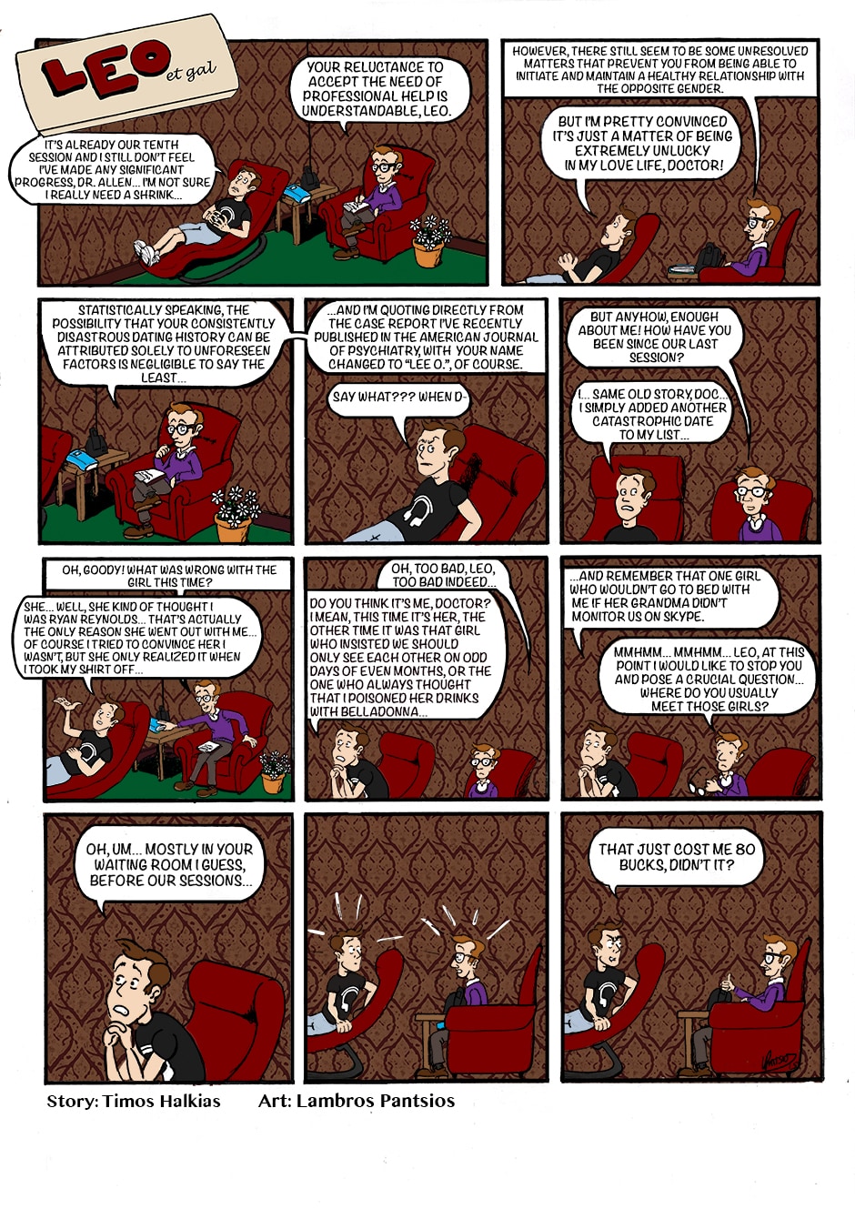 "Leo et gal" is a one- (and occasionally two-) page comic series revolving around the vain efforts of painfully luckless young adult to find his other half, co-starring his gang of phenomenally disparate characters.