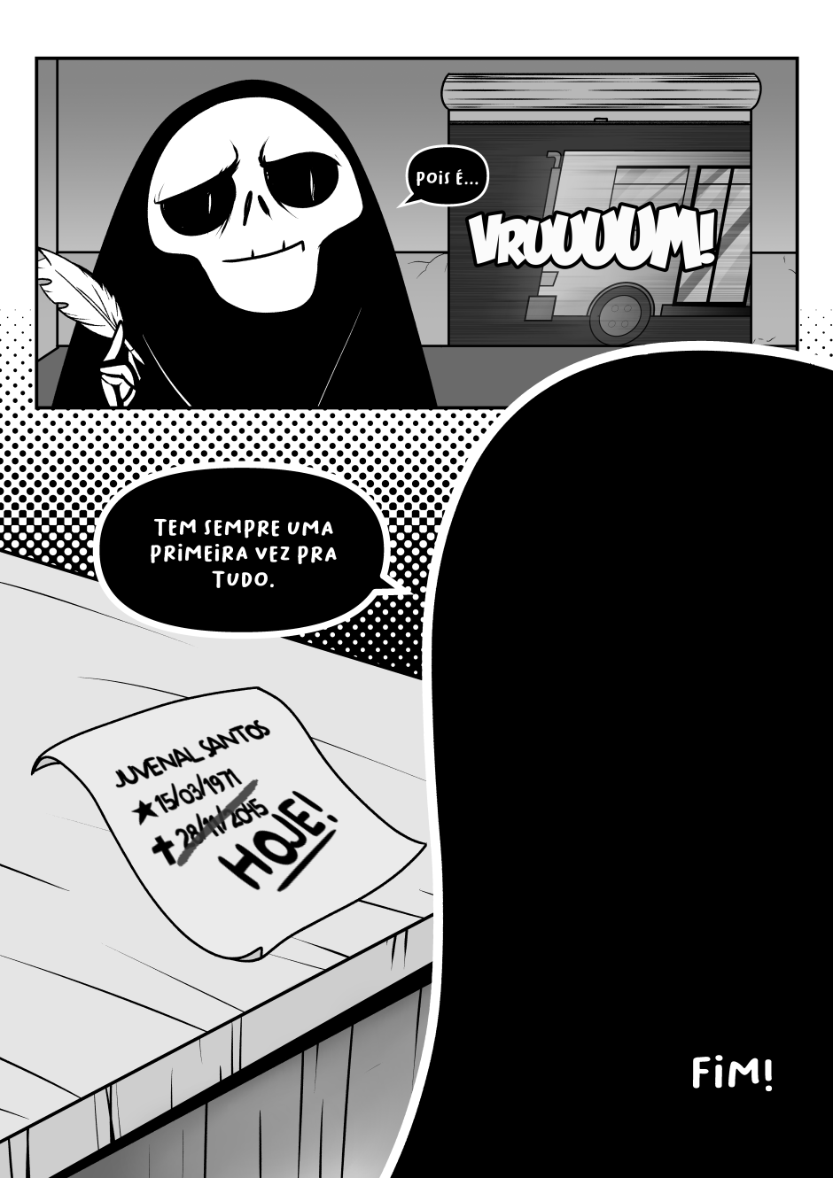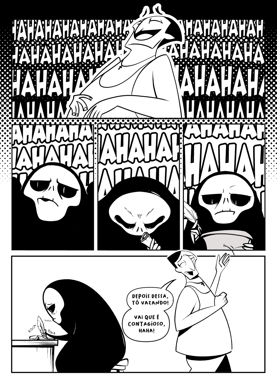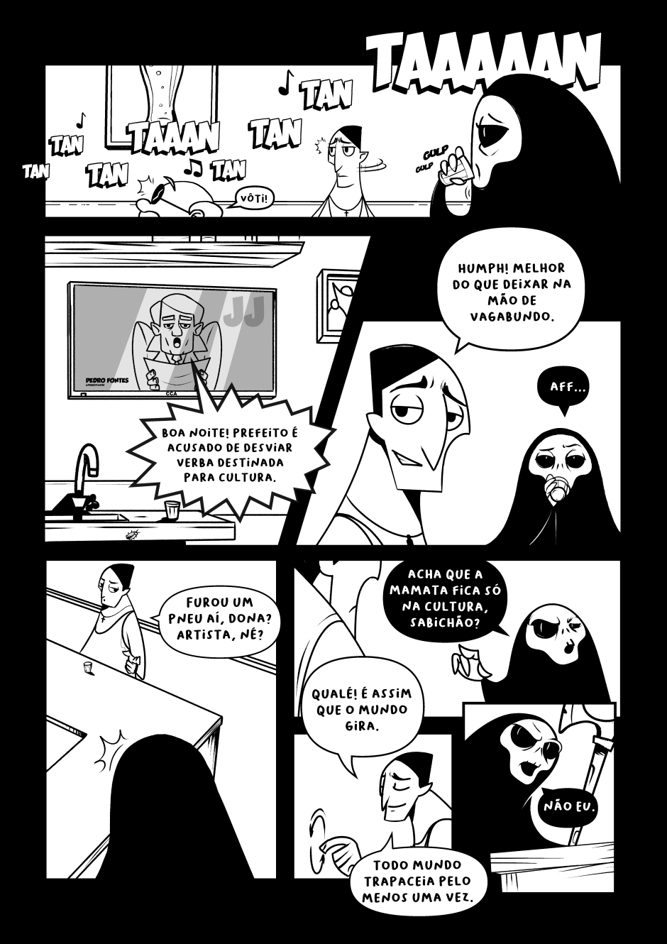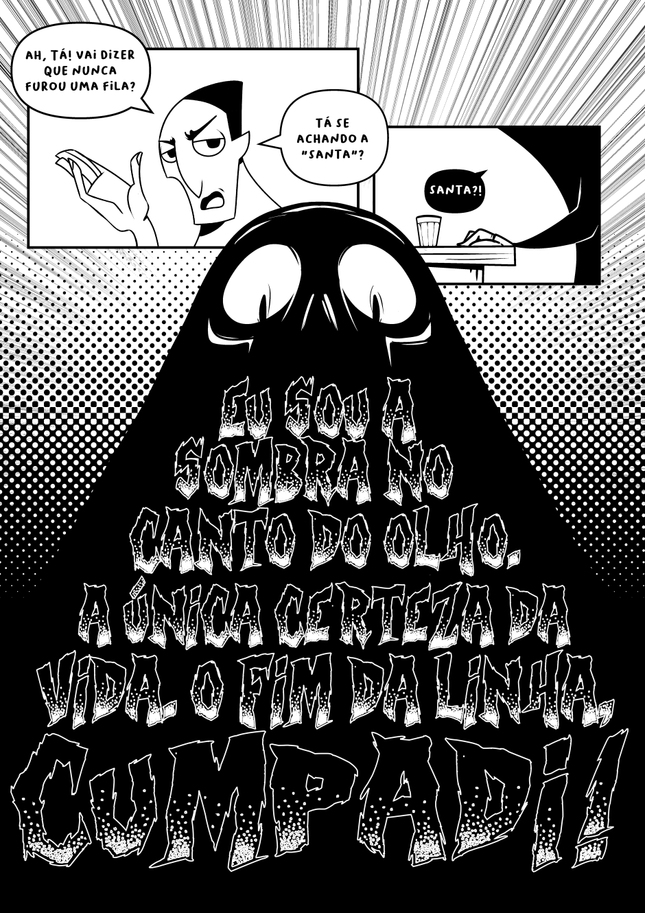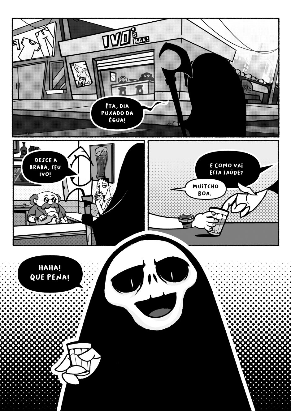 Dona Morte vai ao bar para descansar do árduo dia de trabalho. Mas nem entre uma talagada e outra consegue descanso.