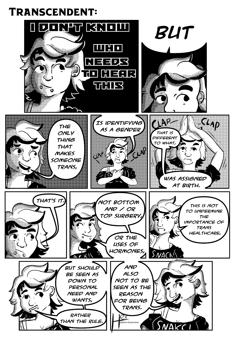 I wholeheartedly believe in the message of this week's comic. I genuinely don't think it is right to dictate who gets to use the label of Trans based on doing it - quote unquote - ‘properly’. Being Trans is an identity open to all who wish to claim it, and does not come with barriers, hurdles and an obstacle course to get there