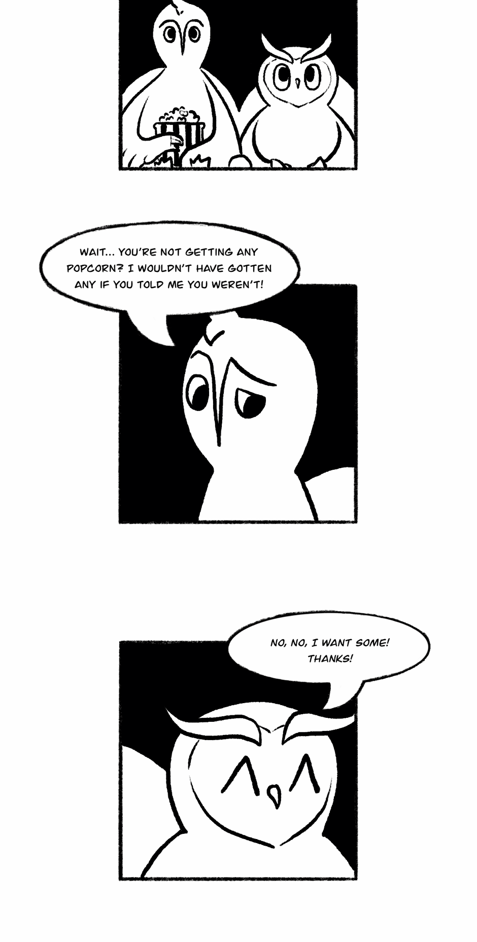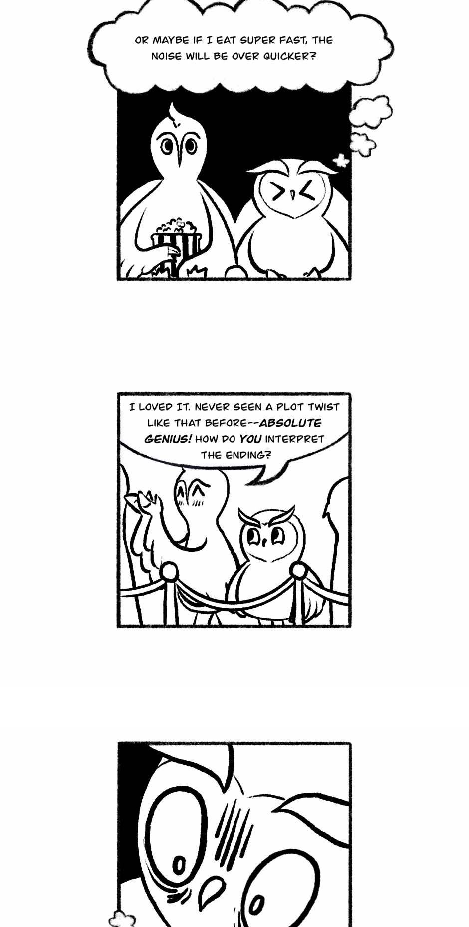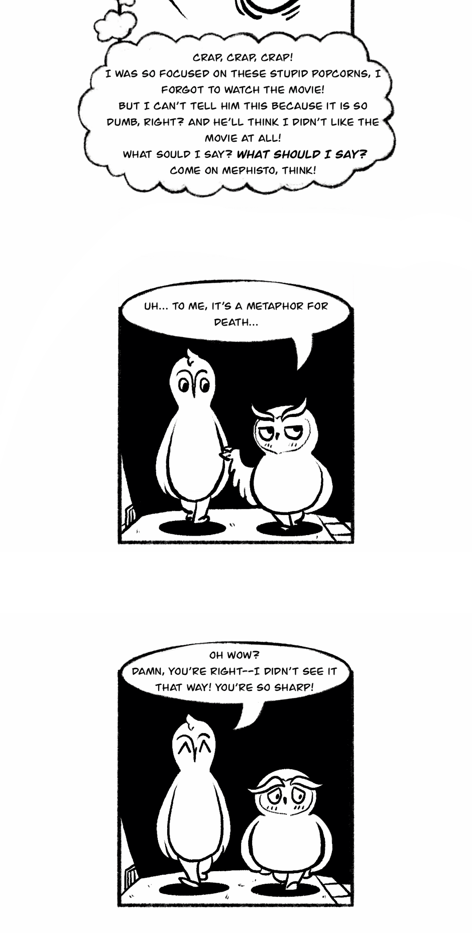 An owl crippled by anxiety tries to survive his daily misadventures. This is a lighthearted series that I draw on my free time to unwind and it shouldn't be taken too seriously. I know it isn't very original but I thought it'd fun and somehow relatable (I hope!).
