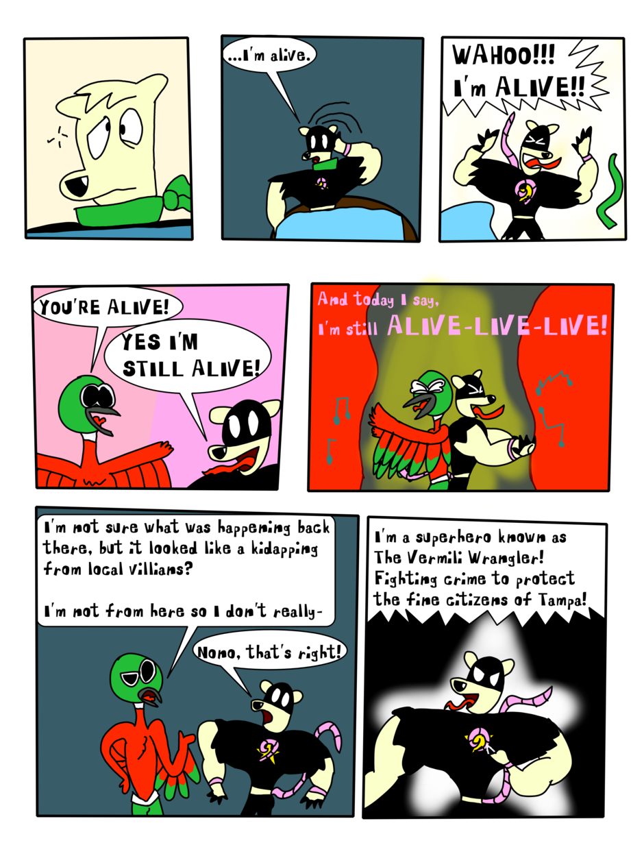 Set in Tampa 2002, The Vermili Wrangler was an ordinary Superhero, a lesser anteater that can run around on all fours and the power to use his tail like a lasso, he did the typical Superhero things. Beating up the bad guys, Saving the day, rescuing the damsels, the norm.