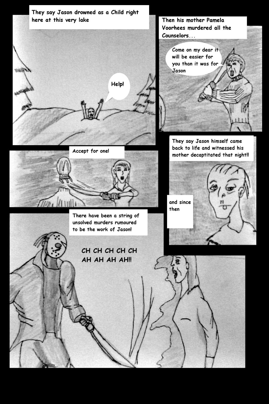 A fan comic I've been working on just for fun.. There's something Fishy going on at Crystal Lake when 4 teenagers from Amity Island visit the old camp.. Soon there being stalked by Jason Voorhees meanwhile people are being slaughtered in the lake is Jason killing all these people or is this something else..