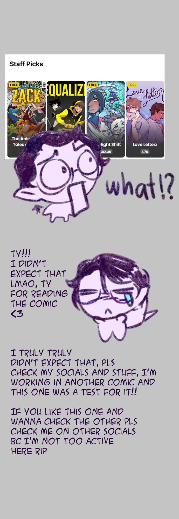 LOL? Hi, hello!! crazy, I started University/College/whatever yesterday and instead of getting ready I was working on this chapter because apparently the comic was on Staff picks! And I think it was kinda cringy getting that and not uploading so hi...