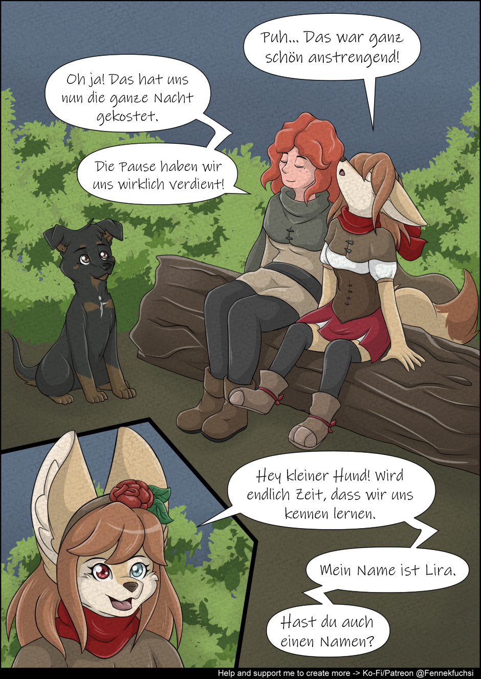 #kitsune_fennek_fuchs_frau_ginger_girl #fantasy_mittelalter_isekai #tabaxi_panther_krieger #furry_anthro #wald #hund_doberman_mischling #pause #kennen_lernen