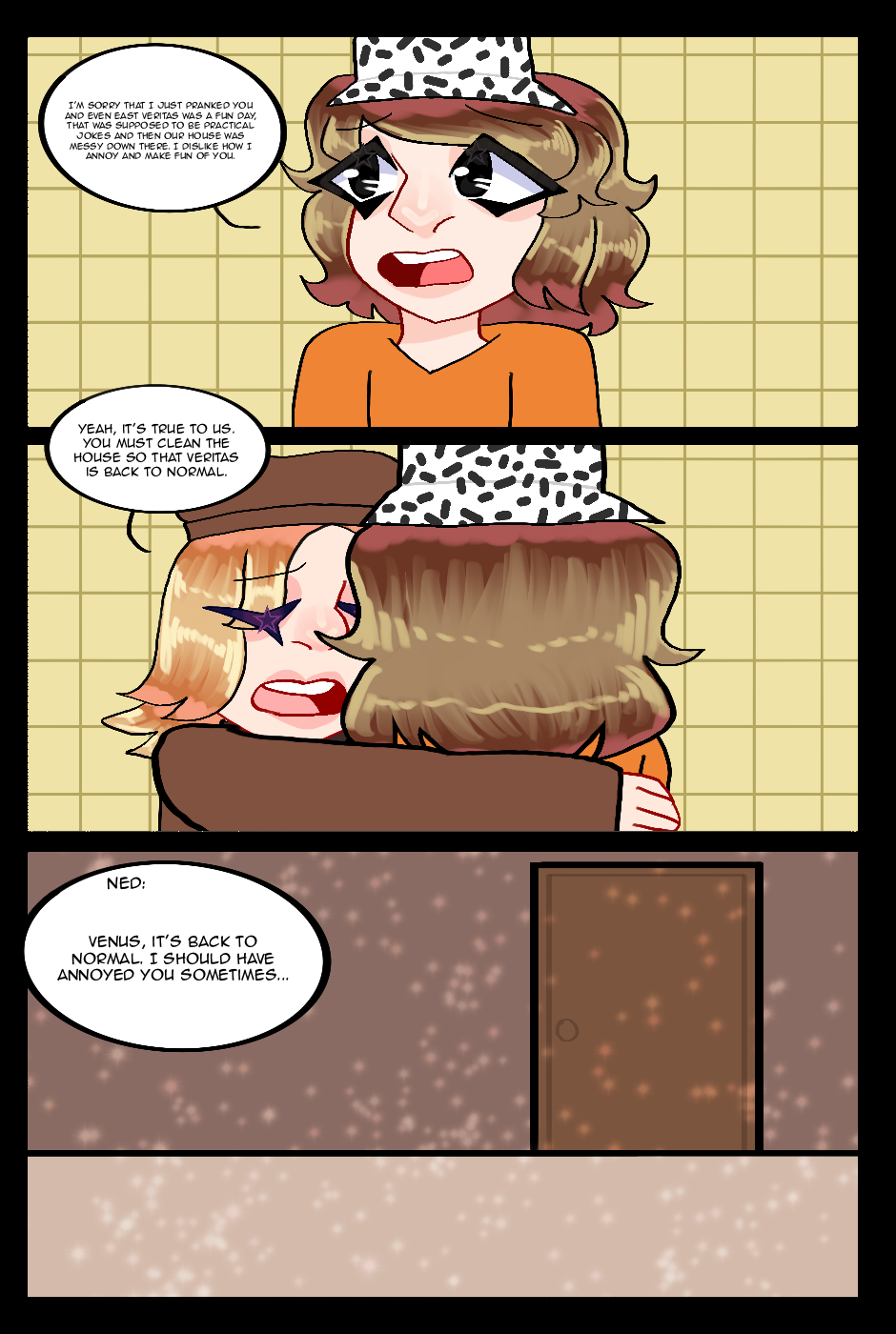 After Venus experienced her short trip, she came home with a lot of jokes that made her upset. She gets revenge as she cleans up the pranks when Ned also got upset. Veritas was back to normal after the prank.