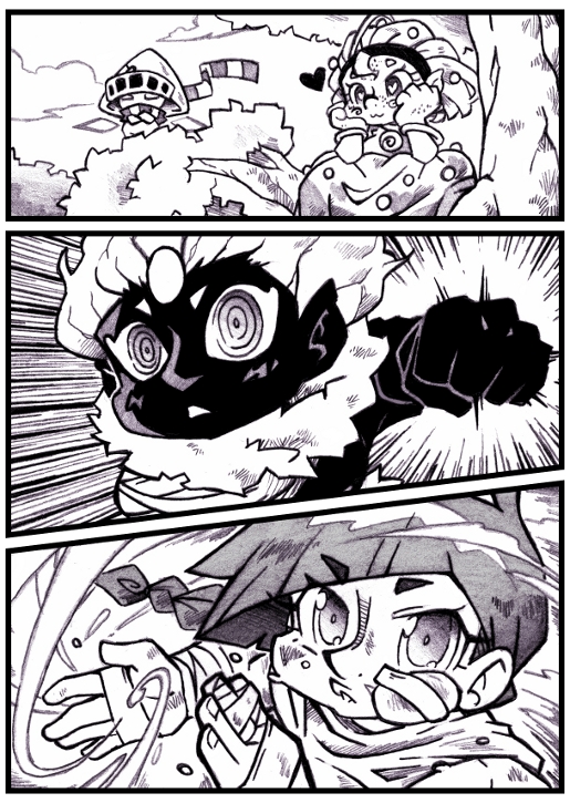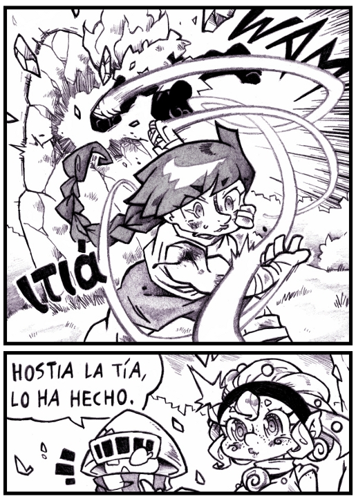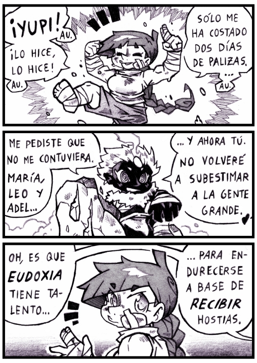 Gwyn ha recuperado su empuje tras perder el brazo ante Trufo, y Eudoxia ha aprovechado para mejorar aún más sus técnicas. Y un par de moratones no son nada a cambio... Es más, parece que alguien opina que es así como se fortalece XD
