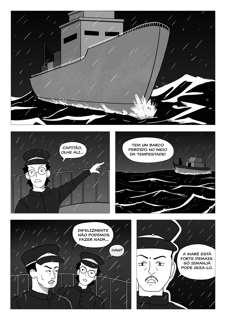 Numa noite de tempestade, um barco tenta retornar a salvo para a terra firme.