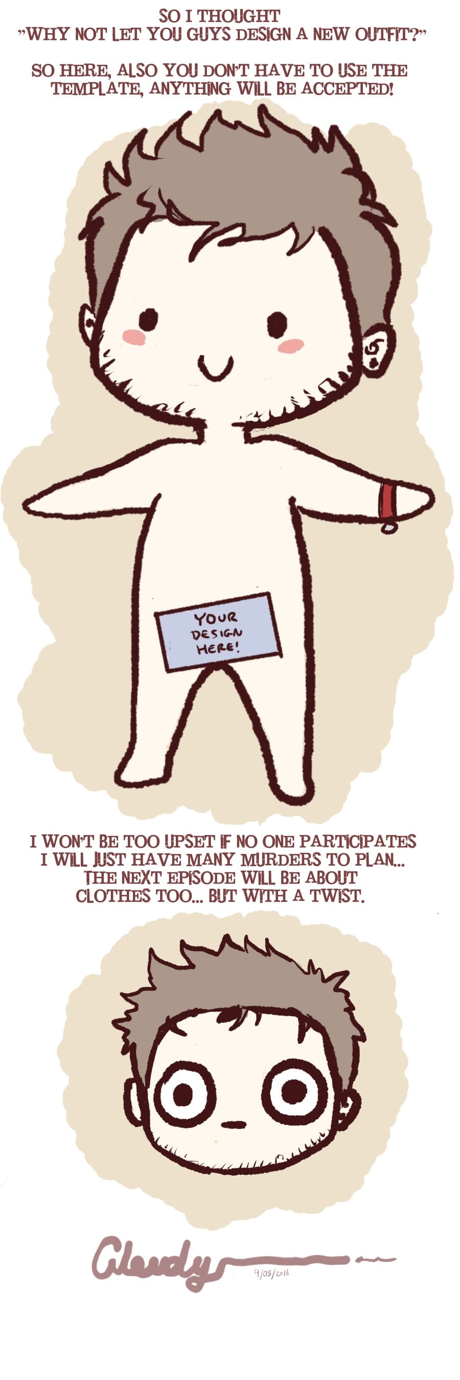 I finally drawdeded something! Been missing my widdle baby so much I just had to do something to keep my mind busy ;u; stuck with stoopid phone still so is very hard to do anything... orz Anyways, so I met Janix earlier this year, I gave her my favourite shirt. It was a magical and awesome tiem~<3 I will make some episodes later maybe. Anyways I need new clothes so I figured I would try to interact with you guys and have you design me an outfit! All outfits will be featured throughout future episodes but I will pick a favourite one (or you guys can vote on them) to wear normally. It can be literally anything. I wanna do new episode next on clothes and it will feature Atrocity!! So I thought I would incorporate this into that ep and I will need one outfit at least before I start that. Hopefully you guys can partake in this, wanna do things with yous! :3