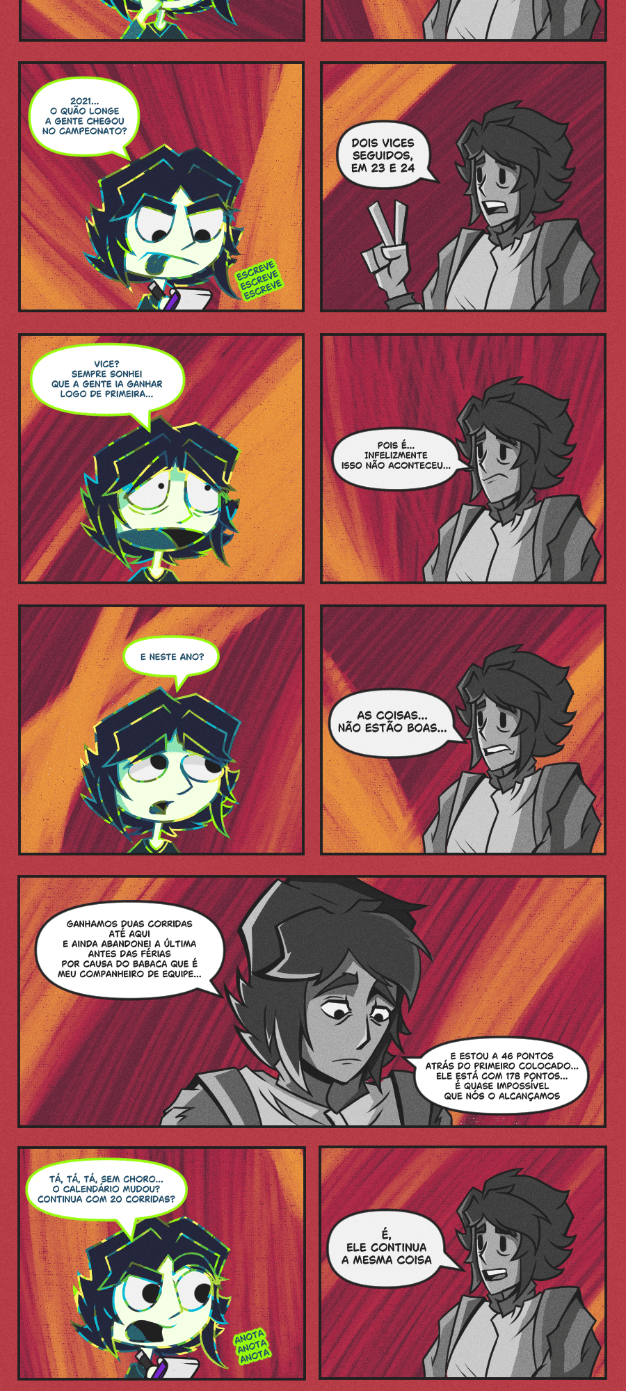 Leona Snell, é uma pilota de corrida da ATOM Team Racing, uma equipe onde juntos, compartilham a mesma cidade de nascimento, Alvorada, conhecida popularmente pelo mundo como “A Capital do Esporte”. Desde os seus 9 anos, Leona tem o sonho de ganhar a AWC e ser a primeira da cidade e do país a ganhar o maior campeonato de automobilismo do mundo! Porém... O que aconteceria se o seu sonho, tornasse o seu maior pesadelo? Onde os pilotos a mais de 300Km/h, no qual competem semana sim, semana não, tendo que dar os seus 110% sempre, podendo te matar a qualquer momento ou até mesmo, você perder o controle de tudo e acabar com a vida de alguém? E se eu disser que isso é um dos menores dos problemas de Leona? Um simples erro pode lhe custar tudo que ela construiu, é sua vida ou seu sonho, é a sua felicidade ou sua conquista, essas são suas opções no momento e a dúvida maior é, qual é a correta? Viver em paz e consigo mesma, porém, ficar se torturando eternamente pelo o que você poderia ter se tornado ou encarar todas as dificuldades da vida, sem reclamar ou pestanejar, mas, sair tão exausta, estressada, irritada, frustrada e acabada, fazendo te questionar se todo o esforço valeu a pena no final?