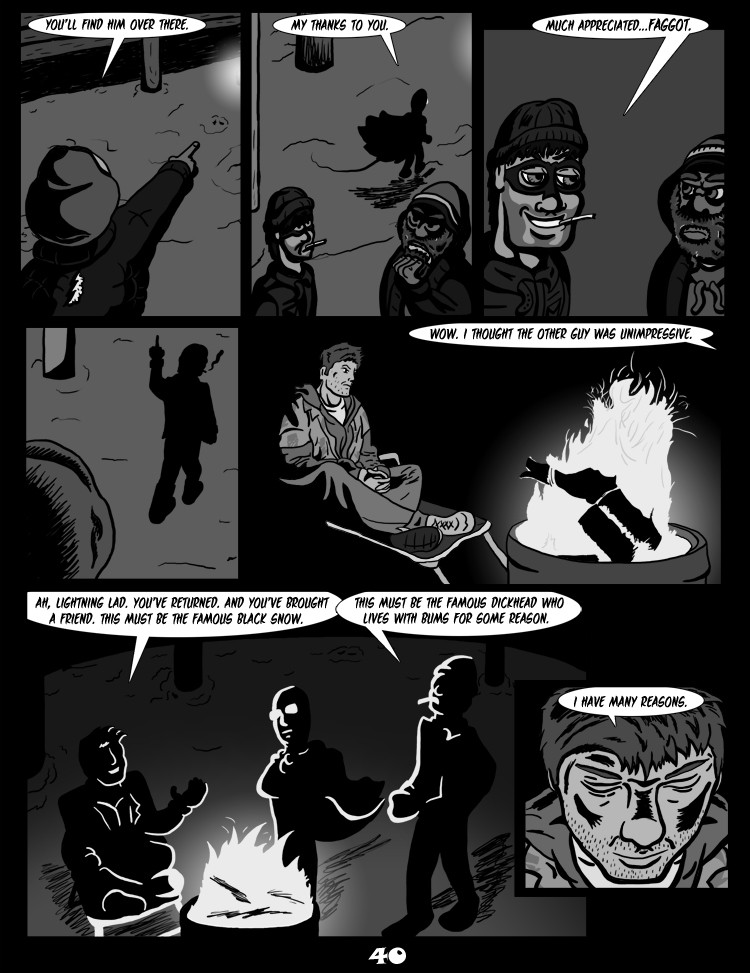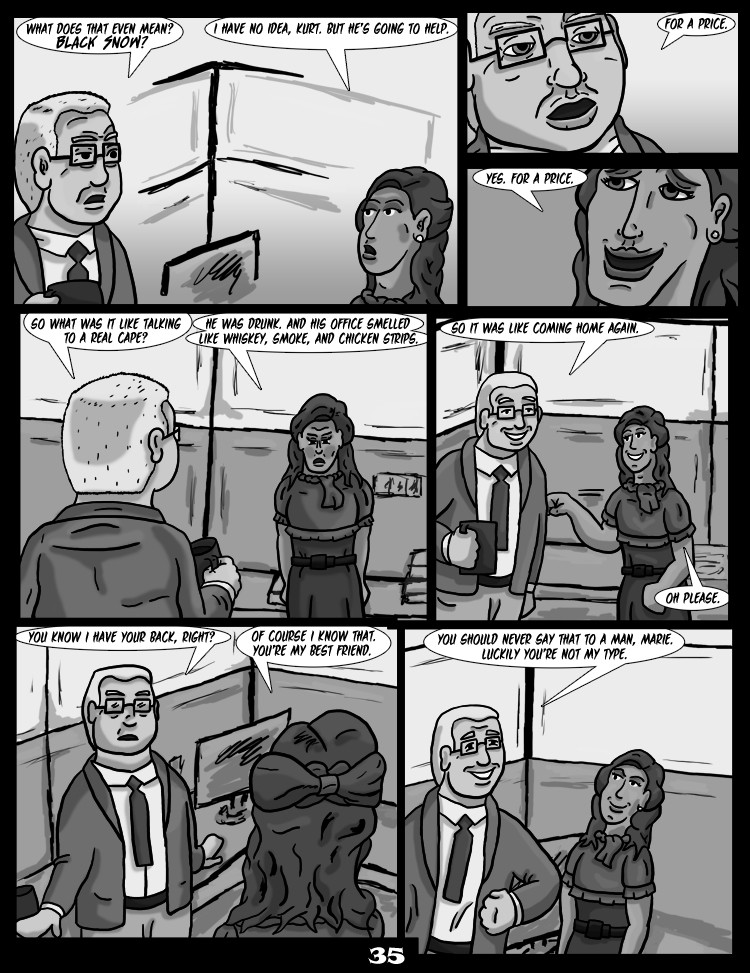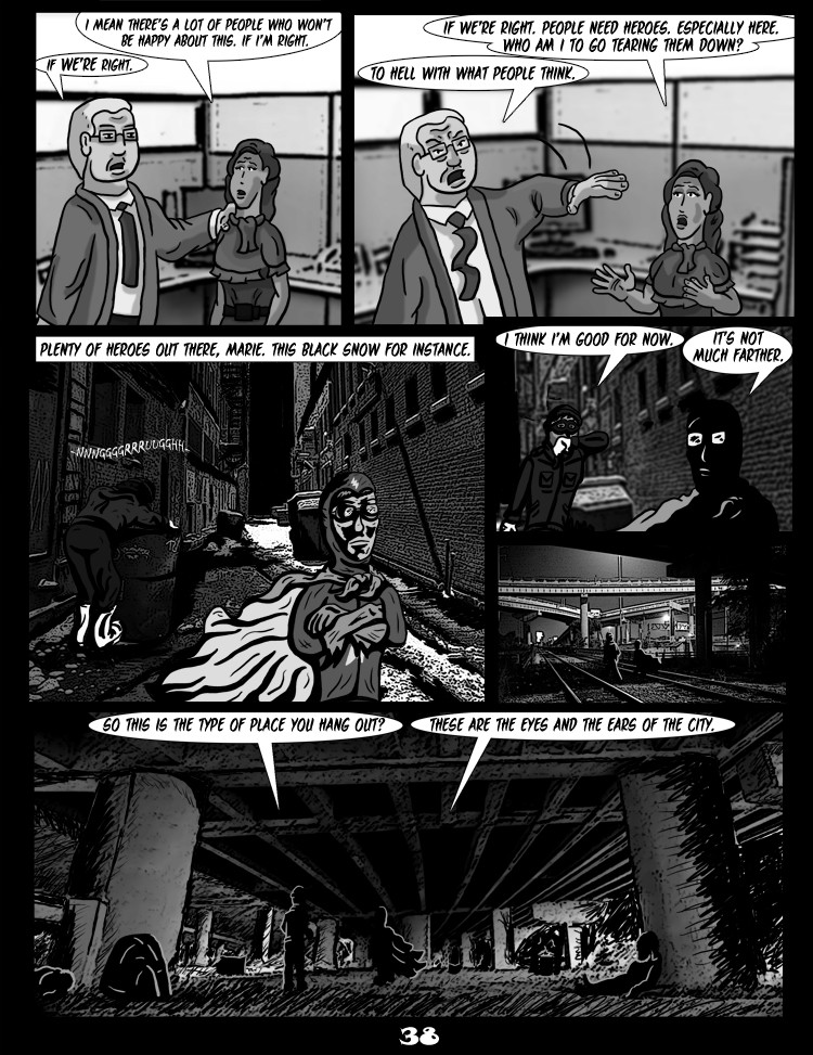 Black Snow is the dark, gritty, yet oddly comedic modern day noir story of a struggling wannabe superhero who inadvertently finds himself in the middle of a gang war for the control of Detroit and the police retaliation. The central figure, Black Snow, is a chain-smoking alcoholic “superhero” who aspires for fame, but has settled for greed, as he has turned helping people in trouble into a business. He has an incredible variety of super powers, but can’t manage to control any of them.