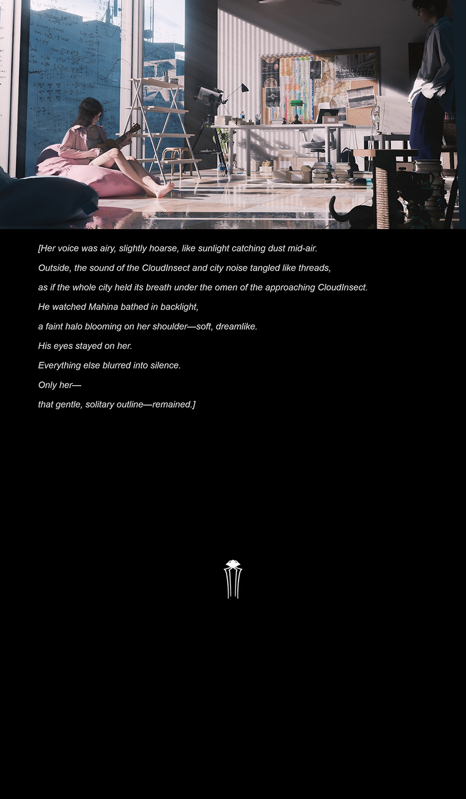 For thousands of years, twelve colossal "CloudInsects" have walked the Earth, each surrounded by a mysterious "CloudInsect Field." Within these fields, all electronic devices cease to function, adding to the enigma. There is still no consensus in the scientific community about the true nature of the CloudInsects—whether they are machines or living organisms. The prevailing theory suggests that these giants are ancient probes left behind by an advanced extraterrestrial civilization during a prehistoric visit to Earth. Despite humanity's continuous fascination and attempts to study the CloudInsects, progress remains hindered by the presence of the CloudInsect Fields, leaving even the most advanced technologies powerless to unlock their secrets.