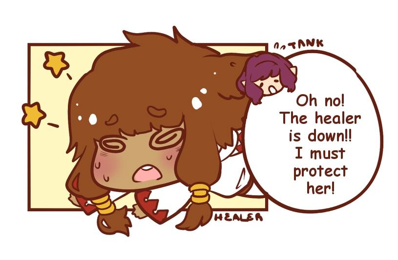protect your healer tiny tank! featuring kimasura! shes a lalafell in ffxiv which is the smallest race so even tho im not that big myself im a long lanky piece of meat compared to her.