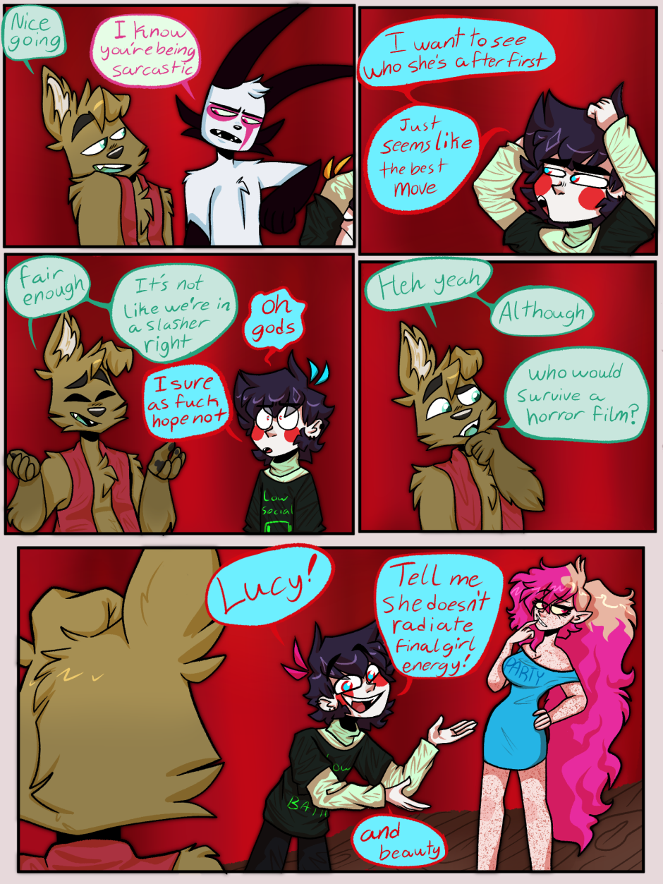 I've been joking about Lucy's final girl energy for years. Ironically Courage is the one with the surname referencing a final girl (Thompson) and Lucy's references one of the greatest female comic characters (Harvestar) Bonus points if you can guess the refences https://linktr.ee/NyxCharlieChaos