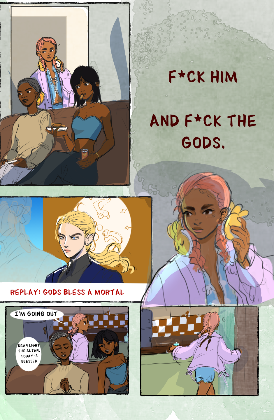 First drag race, first ancient cave exploration, first time in a love triangle. It all becomes an annoying cycle as Umi starts seeing invisible strings and finds themselves stuck in a world where the gods seem to be raining down gifts to everyone except them.