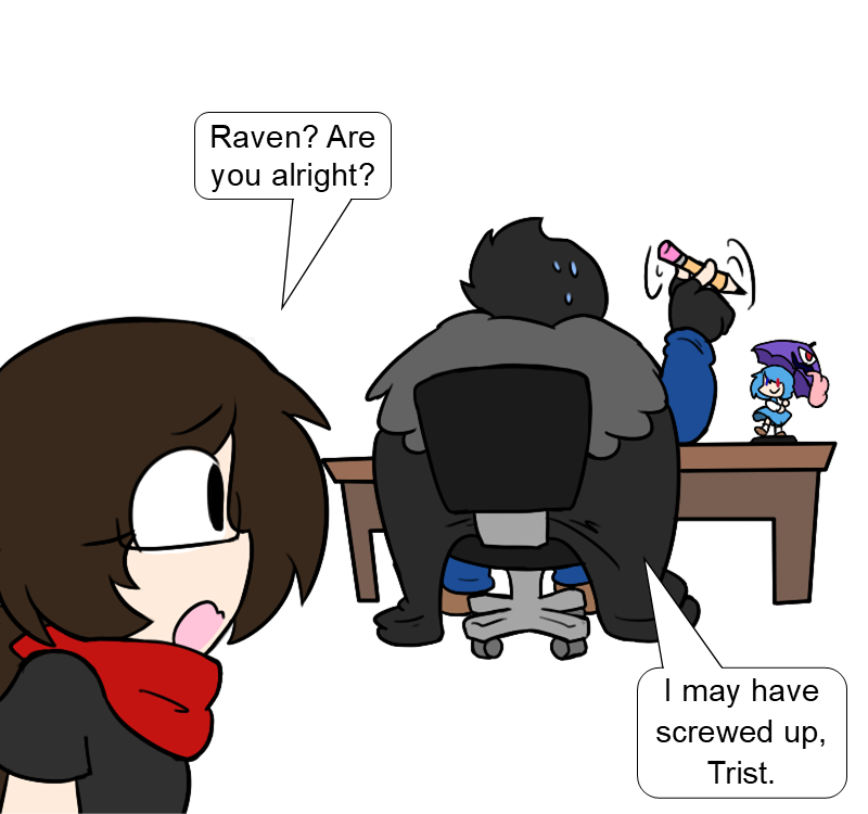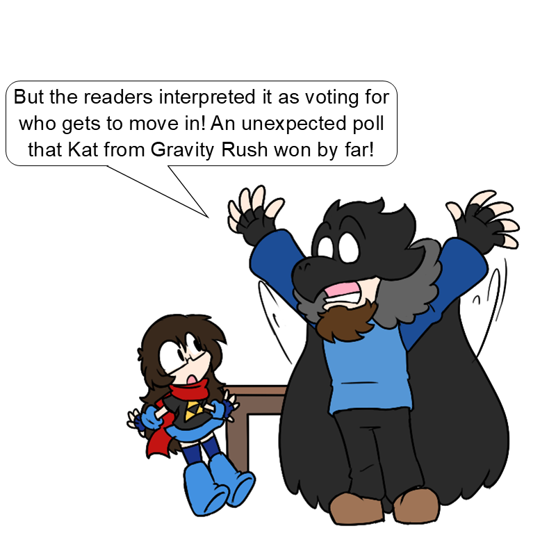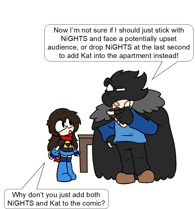 Raven: The first five panels are a very close copy/paste of the Discord conversation I had with Trist trying to figure out how to handle this, so you all can thank her for getting both NiGHTs and Kat in the comic.