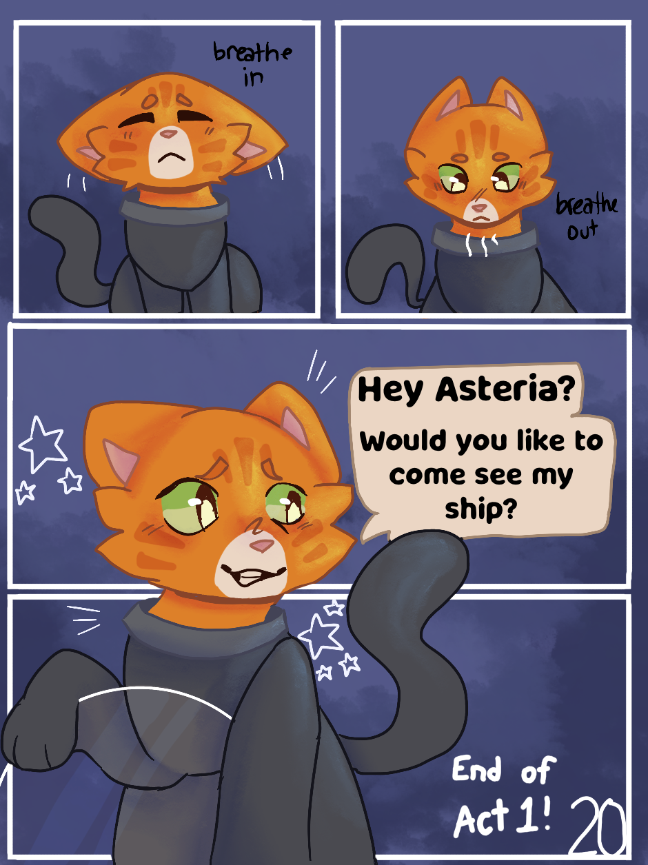 End of arc 1! Thanks for reading guys :3 there’s gonna be a short hiatus, but I’ll be posting reference sheets and little doodles and stuff! Any drawing requests?