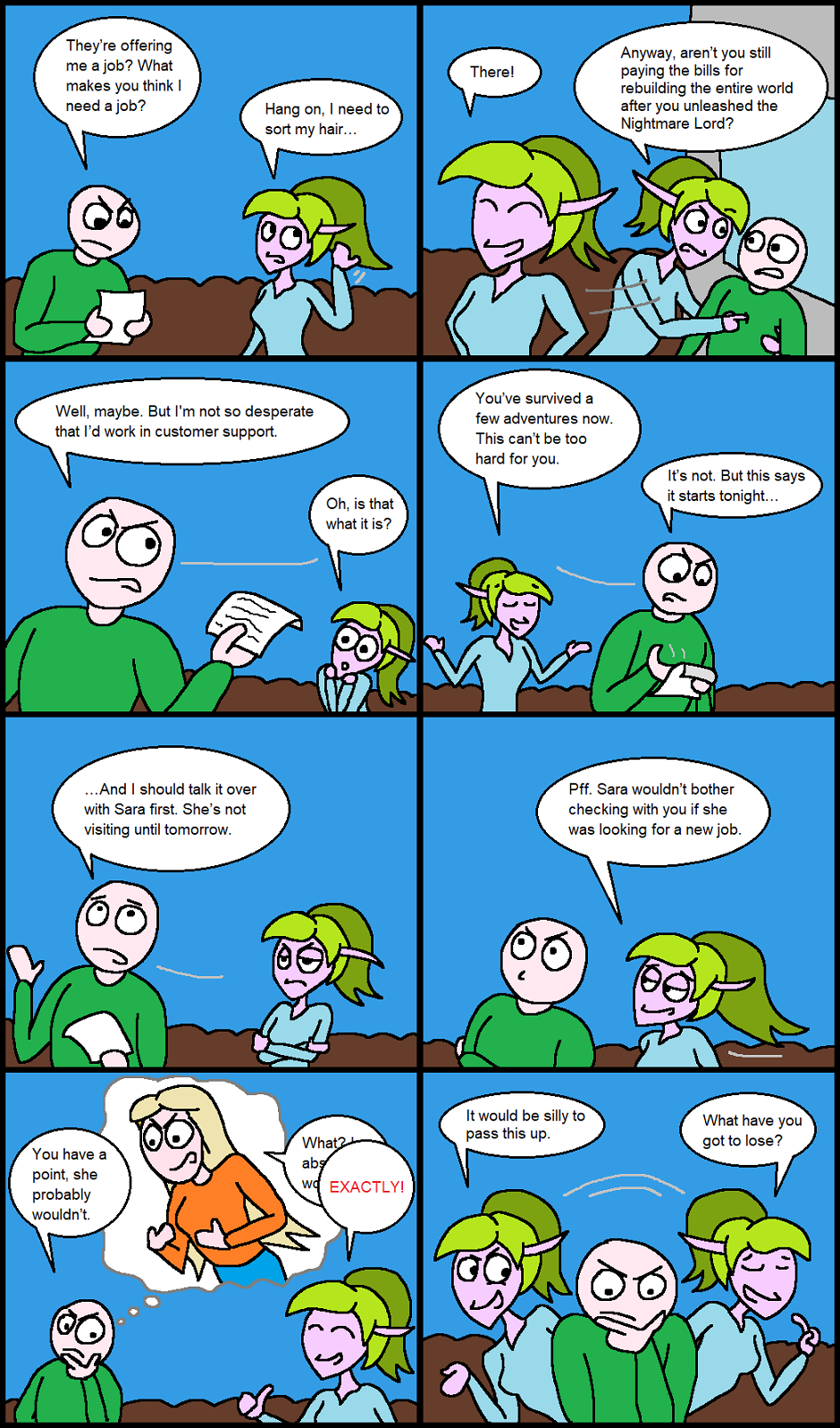 Navyssa appeared in a previous comic I did, and I got her hair wrong in the first comic of this series, which is why she adjusts it at the start of this one.