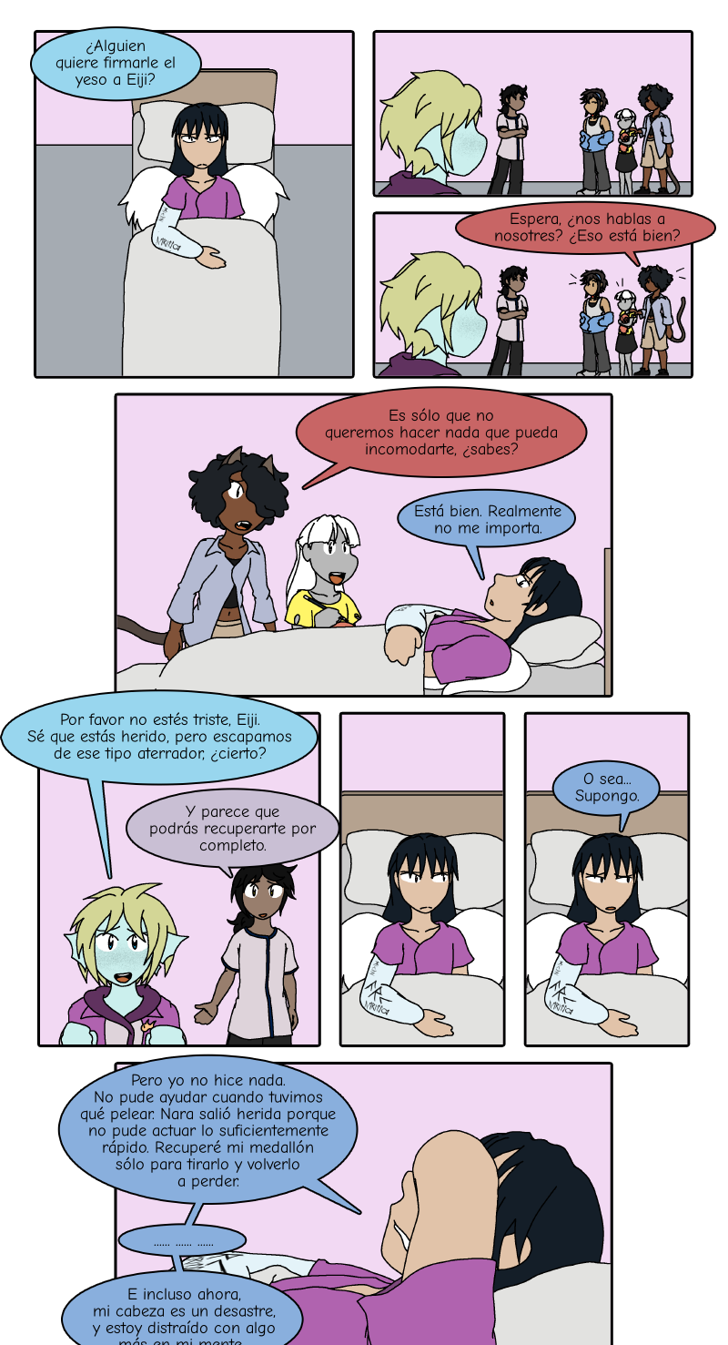 Además, información para nada crucial, pero en el primer panel podemos ver los nombres de Micah y Verity en el yeso de Eiji si miras de cerca. Comenzando en el panel 6, podemos ver que Arc añadió su nombre en letras grandes.