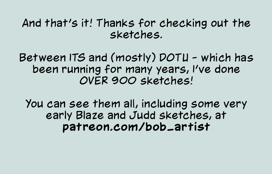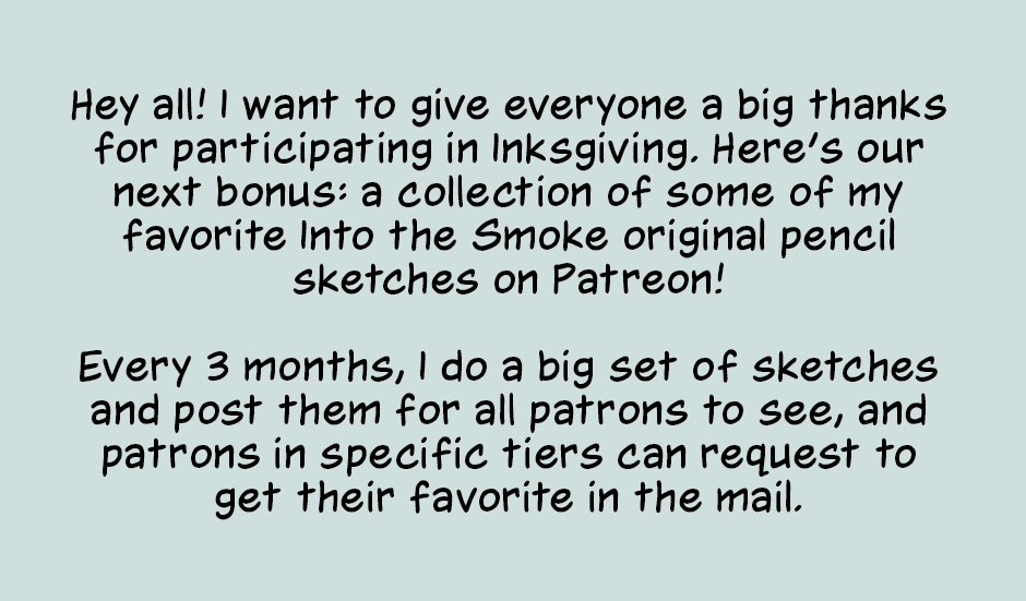 I have one more Inksgiving bonus to deliver, and that's the brand-new spicy sketch! I'll announce the candidates at the end of one of the next ITS episodes and hold the vote in the comments! (There will also be a write-in option, though I don't know if we really need it, since we don't have a lot of ITS characters introduced yet.) Anyway, keep an eye out for that soon!
